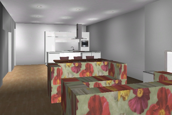 Ich habe den Raum dann mal weiter möbliert, wie ich es mir in etwa vorstellen kann. Finde ich nämlich bei offenen Räumen immer ganz wichtig. Tischgröße ist da jetzt z. B. 110x240 ...also ein richtig großer Esstisch.