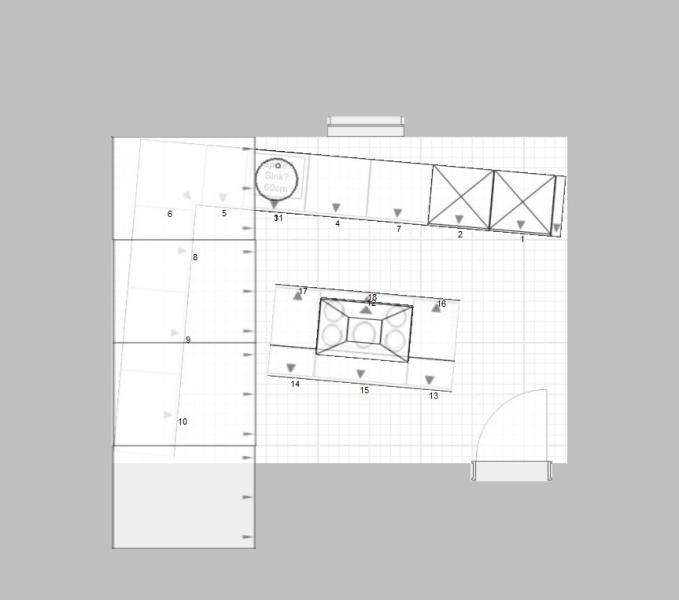 Ich denke, das mit der Insel geht so nicht. Die Durchgänge sind rundherum alle zu schmal, vor allen die Ecke gleich links neben der Türe. Es sollten mindestens 85-90cm sein.