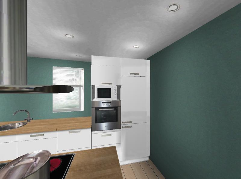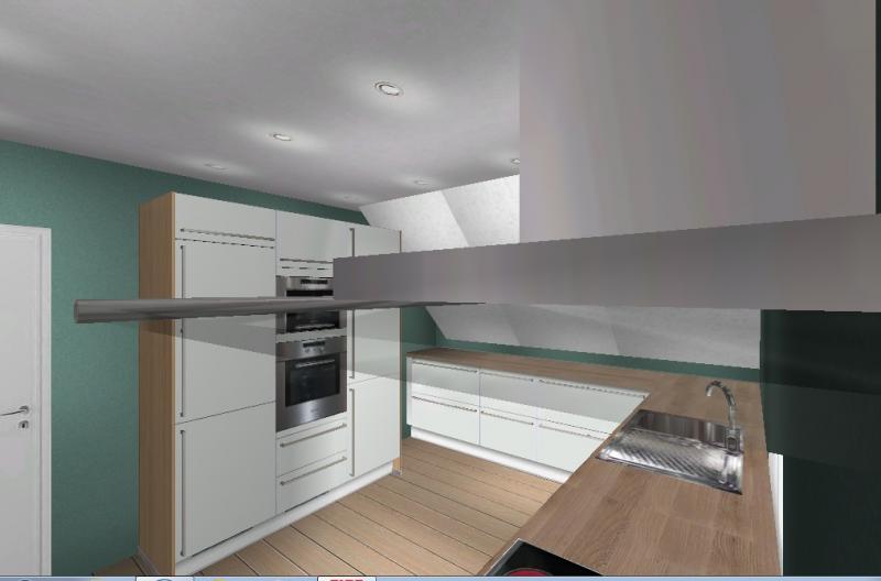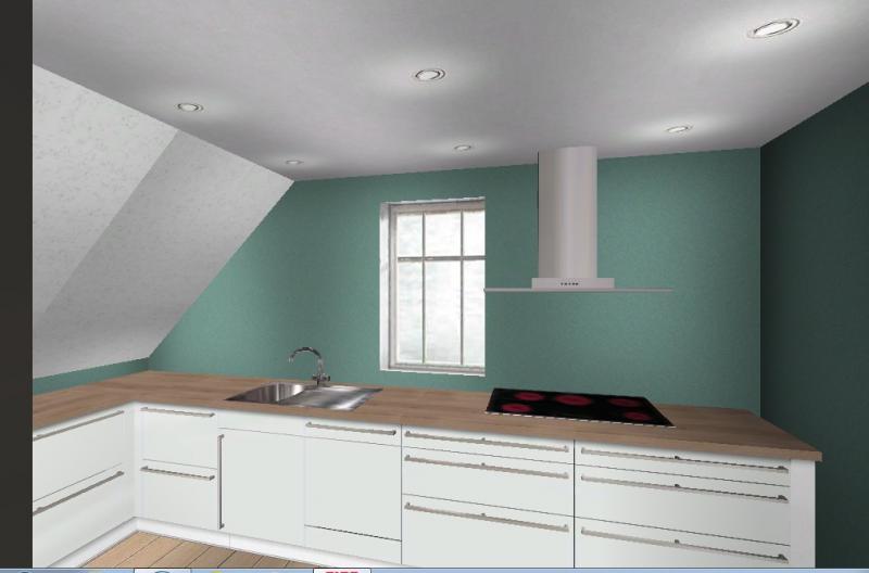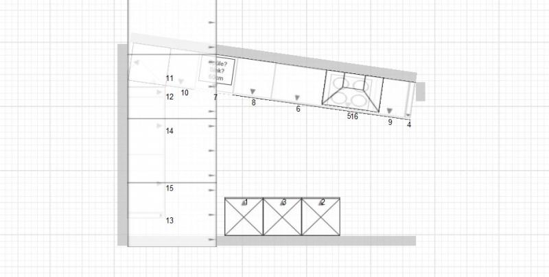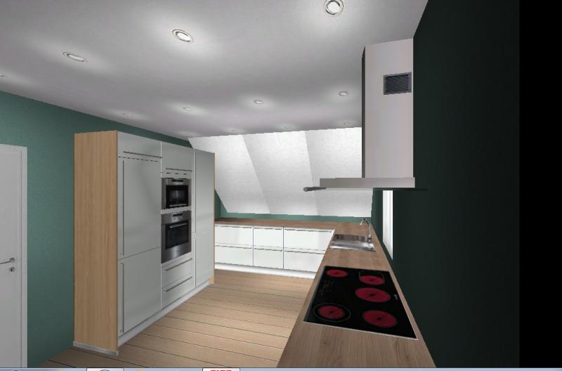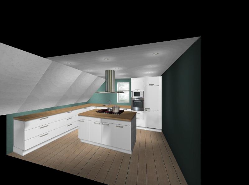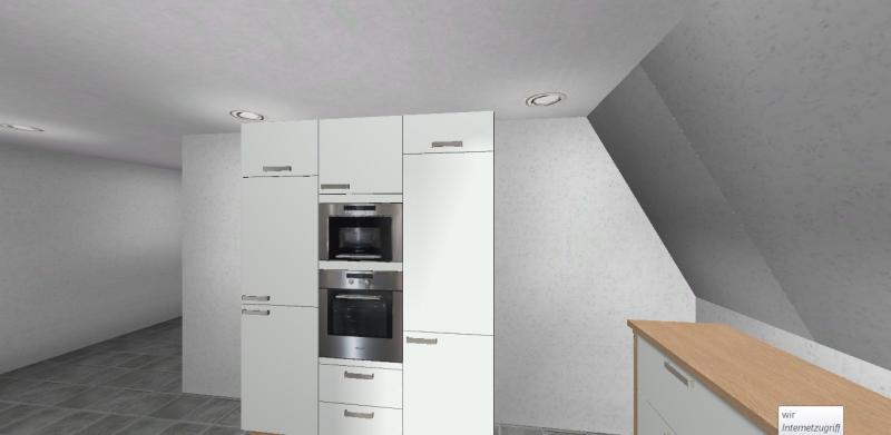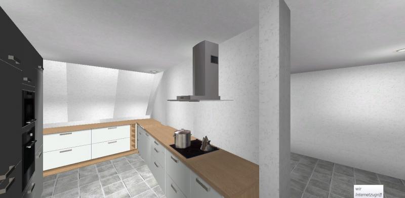 Vorab sei gesagt, dass im Moment eine Ikea -Küche drin steht, die über Eck geht. Also unter der Schräge und unterm Fenster. An der Wand gegenüber dem Fenster steht ein Side-By-Side Kühlschrank und ein rechteckiger Esstisch. Ich werde mal darum bitten, dass sie mir Fotos von der jetzigen Situation schicken.