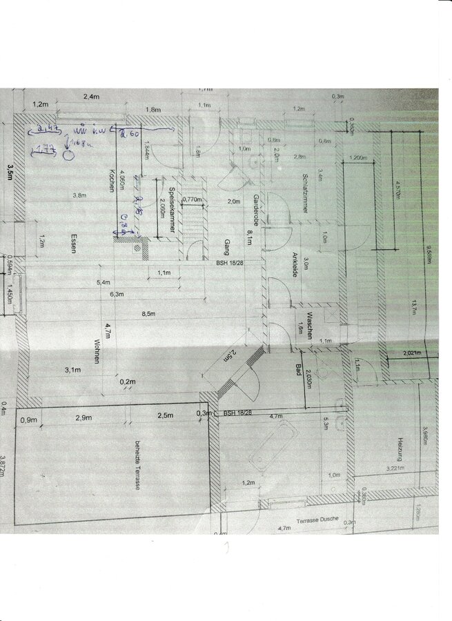 Wir brauchen einen nackten Plan, ohne Küchenmöbel aber mit den relevanten Maßen. Dh, alle Wandabschnitte, Fenster- und Türenposition und Breiten. Es fehlt z.B die Vermaßung des gewinkelten Wandstücks bei der Speise, dh wir wissen nicht, wie lang die Speise ist.