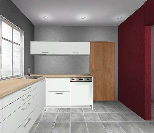 - in der unteren Hälfte des Türrahmens dann auf der Rückseite der Unterschränke zum Flur hin ein schönes (Schuh-)Regal stellen, Arbeitsplatte ragt in die Türöffnung rein.
