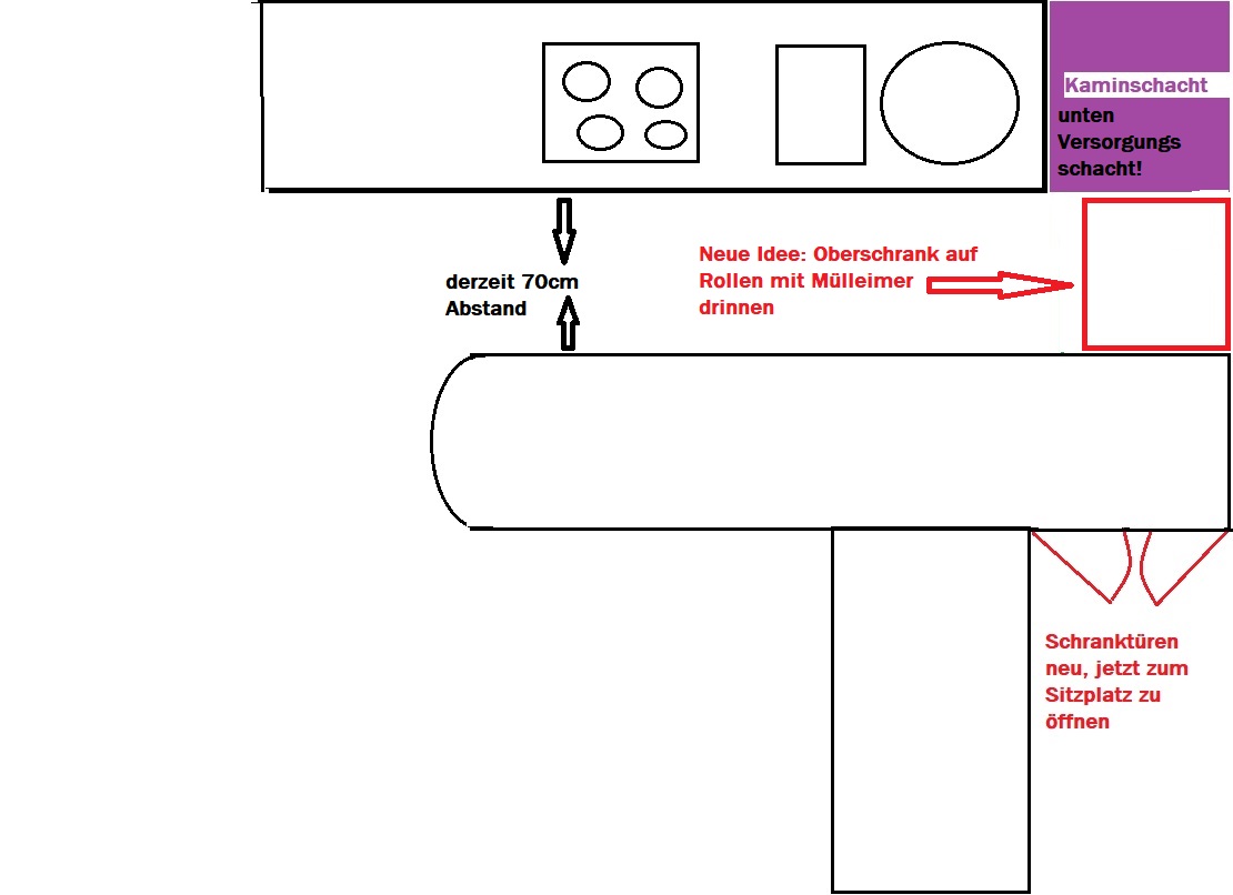 Bei (A) dem Hängeschrank seitlich dachten wir daran diesen auf Rollen zu setzen um die Lücke auszunutzen und oben eben mit der Arbeitsplatte abzudecken. Also quasi eine U-förmige Küche. Das können wir auch selbst basteln, wir würden dann einfach einen extra Hängeschrank nehmen oder aber einen einfachen Hängeschrank von Ikea oder sonstwo kaufen. Hintergrund ist der, das in dem Schacht irgendwelche Rohre laufen die bisher noch nie angeschaut wurden aber unten im Schacht ist eine Klappe, also könnte ja theoretisch der Hausmeister morgen vor der Tür stehen.