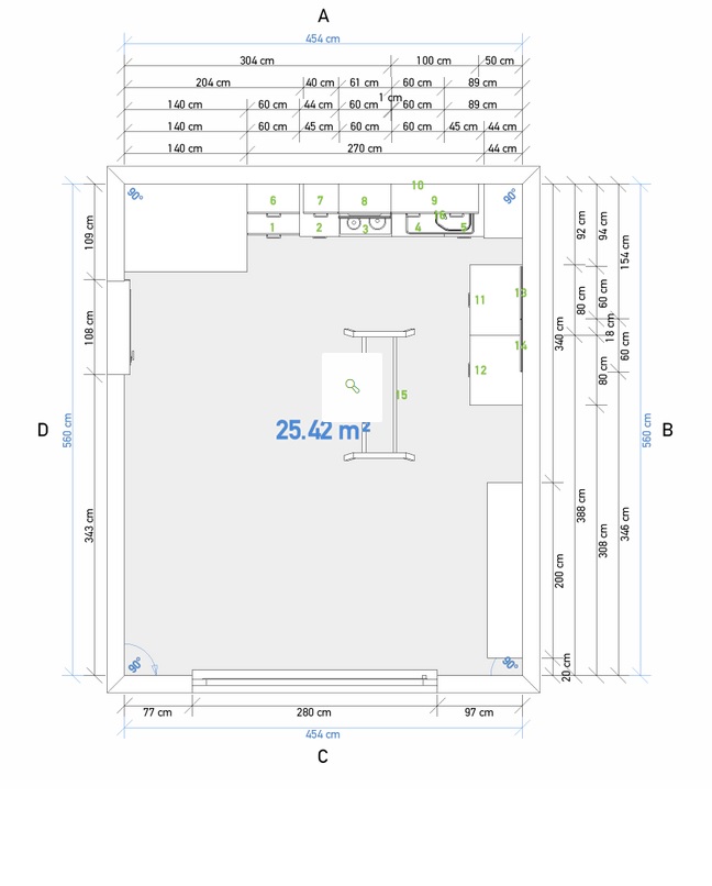 Die derzeitige Küchenzeile an der Wand ist 2,70m lang. Etwa 10cm wären vielleicht durch versetzen der Wand zum Abstellraum noch möglich. Würden wir die Wand so belassen, ließen sich bei 2,80m die Schranktüren nicht mehr komplett öffnen.