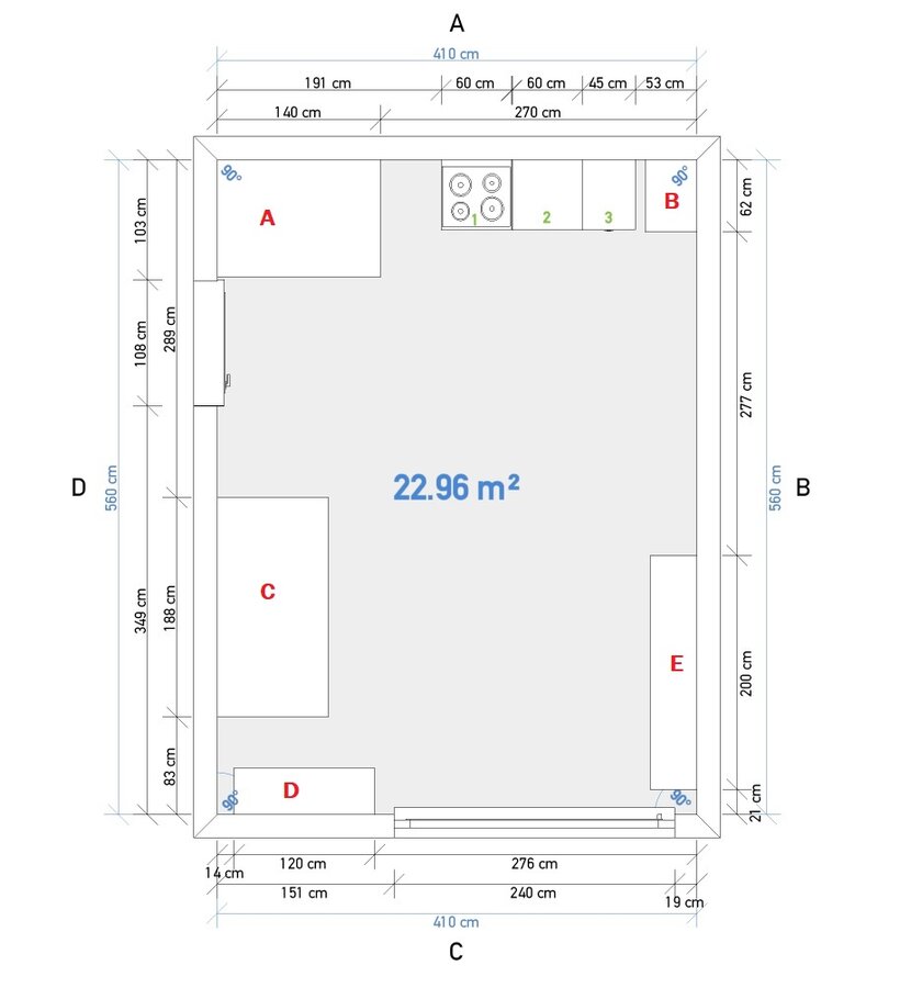 Das mit dem L ist super, aber der Tisch müsste weiter an den Rand / kleiner. Gegenüber der Küchenzeile, an der Wand mit Sideboard B ist komplett Fensterfront mit der Balkontür. Die Laufstraße ist also unter anderem ständig: rein ins Wohnzimmer, raus mit der Wäsche o.ä. auf den Balkon.