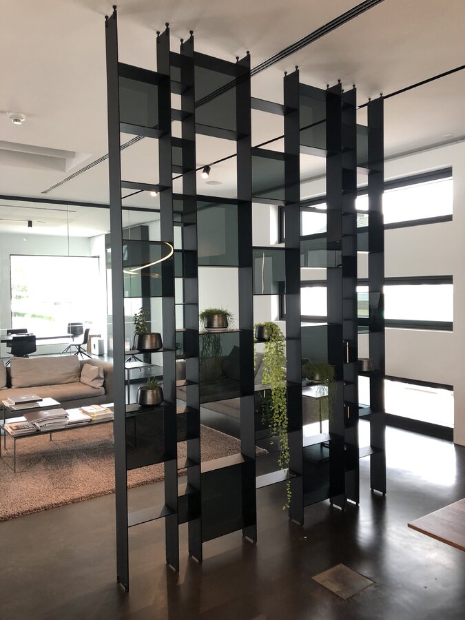 Du kannst an die Säule auch ein schmales offenes raumhohes Regal dran setzen, und den Bereich damit ganz dezent unterteilen. Im Bild ist das Regal etwas überdimensioniert, aber nur 1 oder 2 Elemente davon würden in Verbindung mit Beleuchtung eine wohnliche Atmosphäre schaffen.