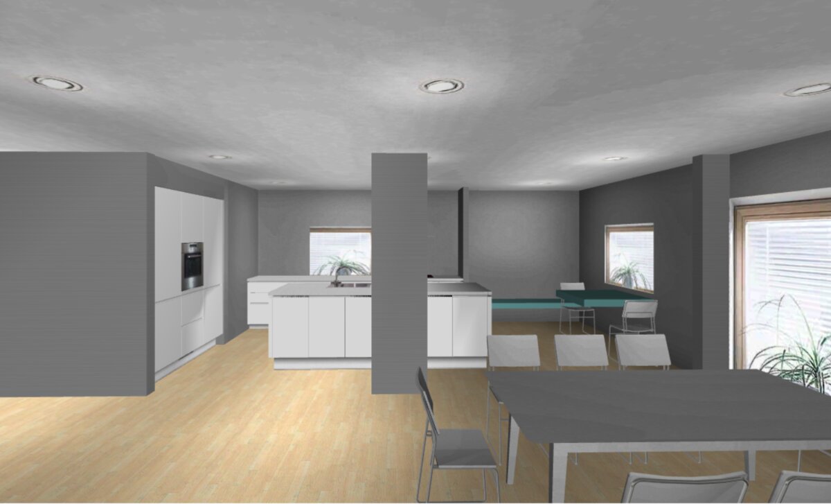 Das planrechte, kurze Wandstück neben der Terrassentür würde ich ca 1m belassen, man muss nicht alles überall hören und sehen. Im Spielseite kann man da ein Regal stellen. Die Möblierung im Spielbereich ist nur so reingemalt.