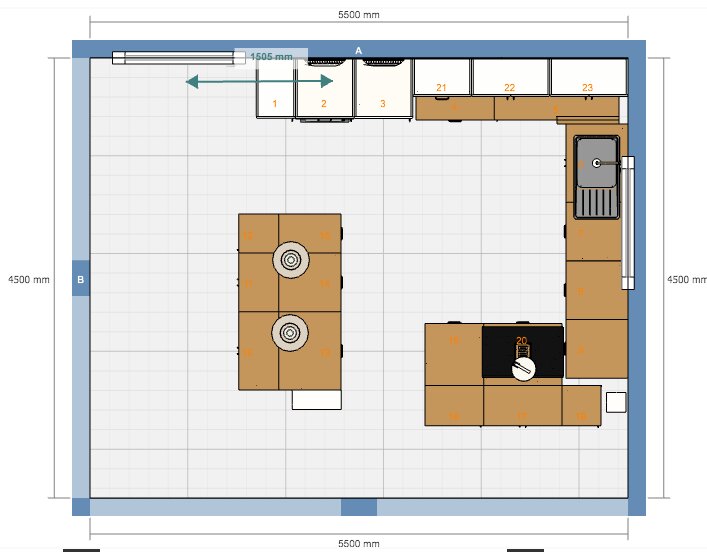 Der Abstand zwischen der Zeile planoben und der Insel mit 180 cm ist viel zu groß. Ich hab nur 90 cm, weil es nicht anders ging (fühle mich damit aber happy). 120 cm wären sicher optimal, würde ich auch nehmen, wenn ich die Option hätte. Aber eine doppelte Entfernung als ich sie jetzt habe, kann ich mir überhaupt nicht vorstellen! Mal eben was aus dem BO oder aus dem KS raus holen und abstellen. Da brauche ich eine Abstellfläche in Armlänge und nicht eine in 180 cm Entfernung. Wir kochen auch zuzweit. Wenn du die Möglichkeiten wie Insel und den Platz in Form von weiteren Arbeitsflächen hast, dann arbeitet man ganz anders! Man klebt nicht aneinander. Es ist viel kommunikativer sich gegenüber zu stehen und Augenkontakt zu haben. Den Abstand von 120 cm brauchst du, um mal an einander vorbei gehen zu können, auch das wird nicht ständig passieren, wenn du eine gute Planung hast. Im U wie du es ursprünglich geplant hast, ist es eng und man hat keine Ausweichsmöglichkeiten, da mögen die von dir favorisierten 150-180 cm noch irgendwie vertretbar sein, aber nicht mit einer Insel. Ich würde im Hauptbereich 120 bis maximal 130 cm einplanen und zur Kopfseite der Insel 100 cm.