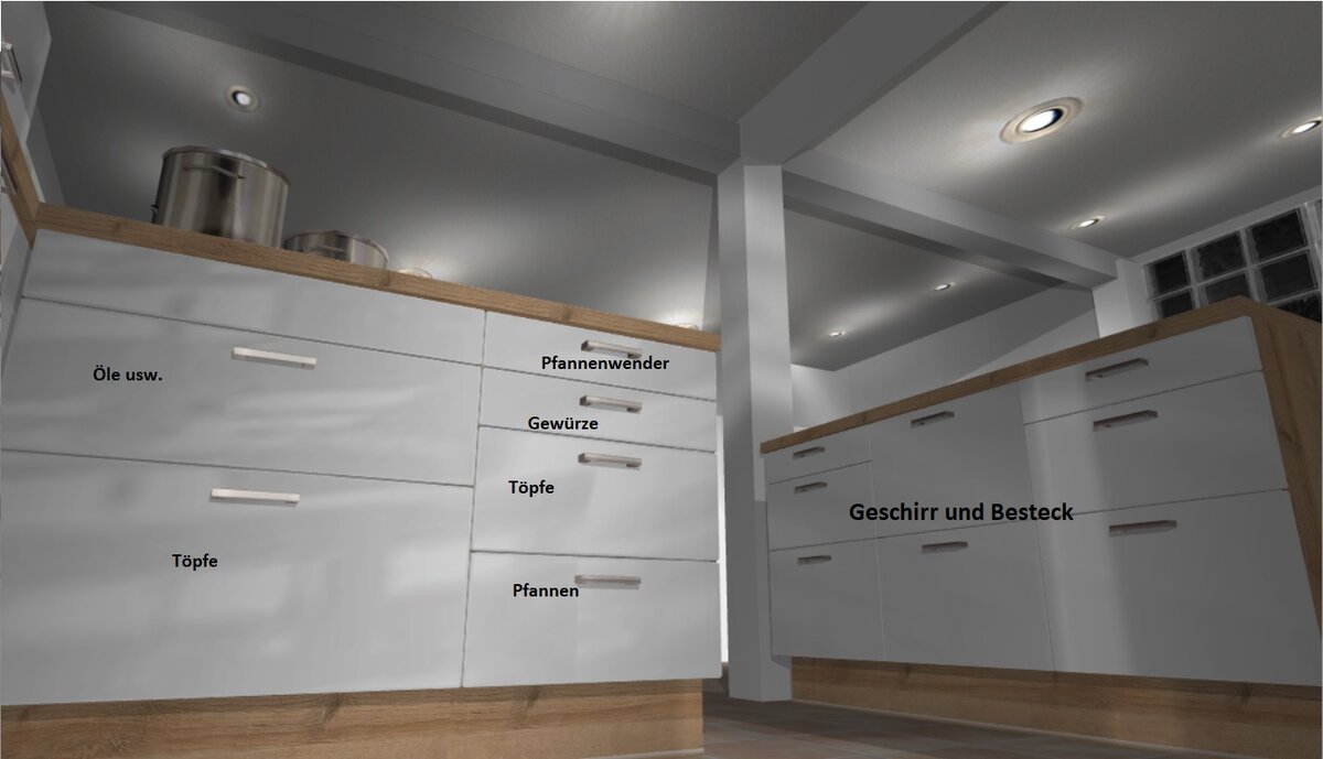 Eine Stauraumplanung sollte die Höhe der Gegenstände berücksichtige, um die optimale Aufteilung der Schubladen und Auszügen zu finden, das ist noch zu grob.