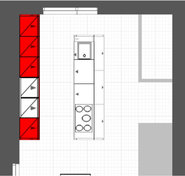 Die Hochschrankwand ist jetzt ca. 4.10m geworden und die Insel 3,10m x 1m.