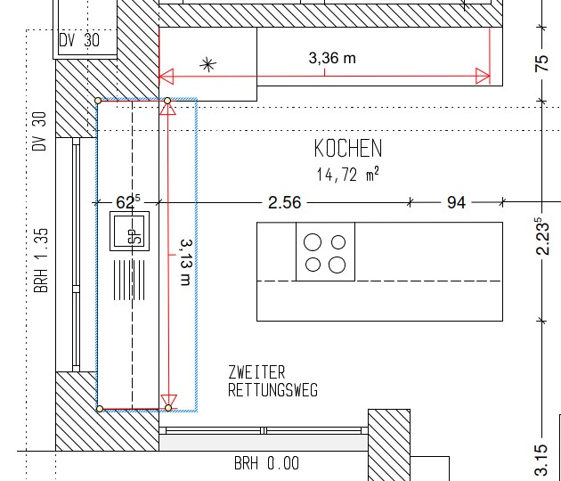 - es wird eine Mauer als Abschluss der Kücheneinbauschränke geben, somit ist die Breite nur 3,36m (rot markiert)