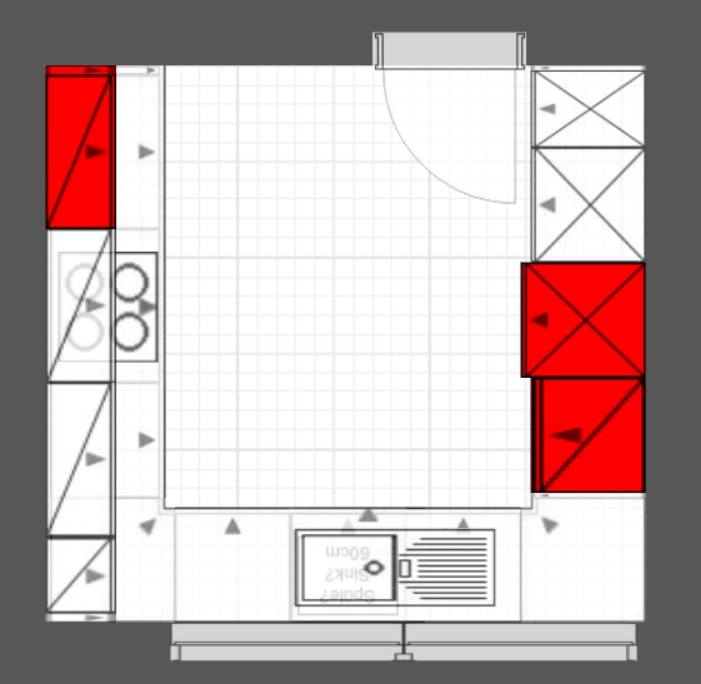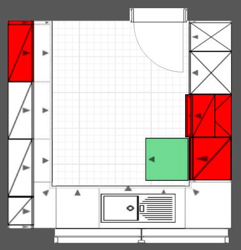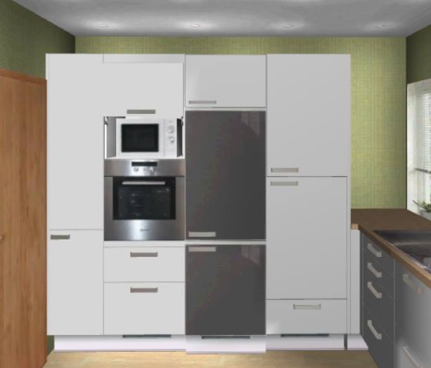 Ich möchte gerne meine vorhandene Kühlgefrierkombi (188 cm hoch, 60 cm breit, 65 cm tief) integrieren. Da ich einigermaßen viel Platz benötige, da ich viel Fleisch für meine Hunde einfriere, werde ich noch einen Gefrierschrank in den Keller stellen. Für Hochschränke und die Kühlgefrierkombi ist auf der rechten Seite gut Platz.