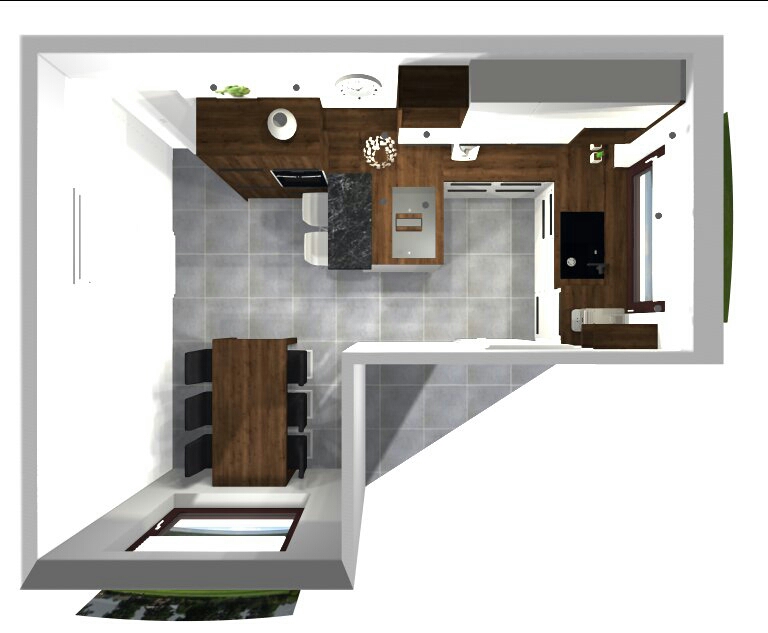 Grundsätzlich würde ich auch evtl drüber nachdenken, an der Hintertür eine kleine `Dreckschleuse` zu bauen und den Rest des Raumes zur Küche zuzuschreiben.
