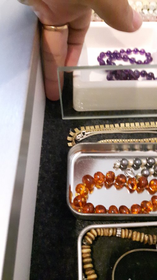 Aber die Glaseinleger sind nicht so optimal, da die hinten raus ein Kunststoffteil haben, das nur auf einer Seite schön aussieht, weil es hinter der Schublade verbunden wird: