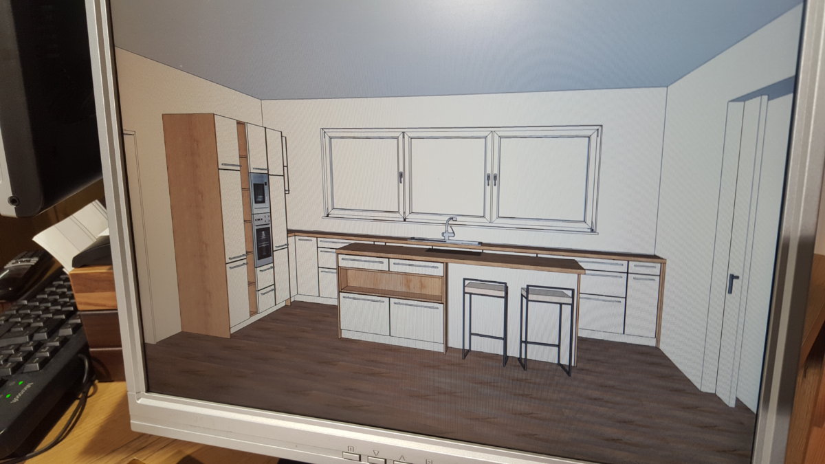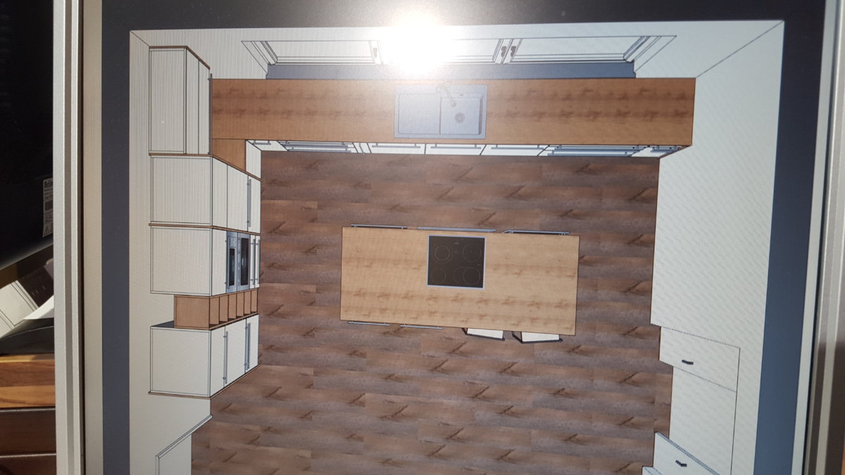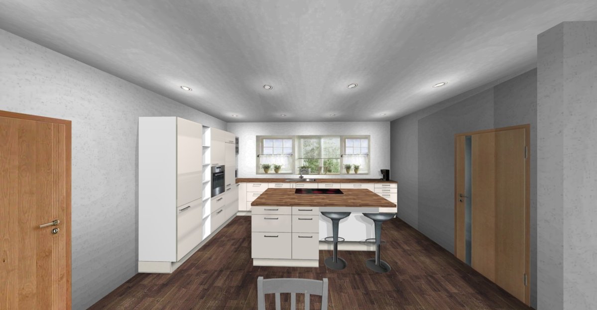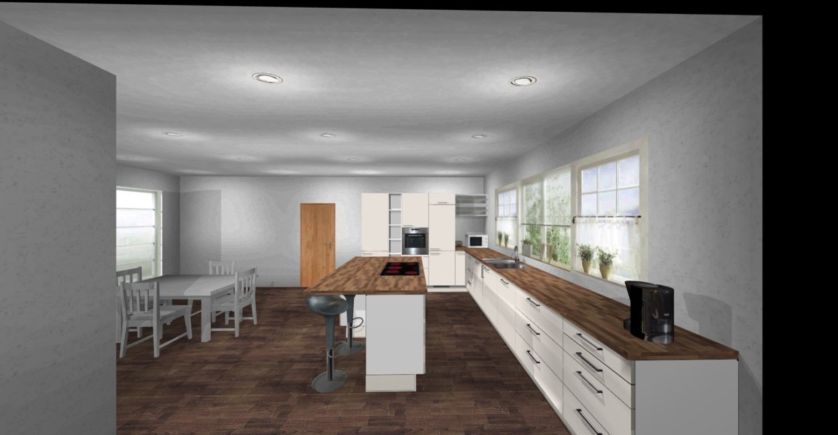 Es ist ein Komplettumbau, Fußbodenheizung kommt erst. D.h. es ist noch alles möglich, wobei ich die Spüle an der Fensterfront haben will, weil ich auf der Insel das ganze Schneiden und vorbereiten unterbringen will und die Insel auch als Buffet bei Festen verwenden will.