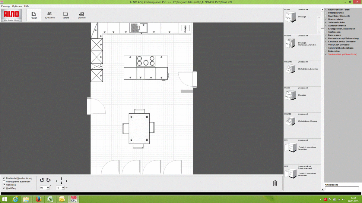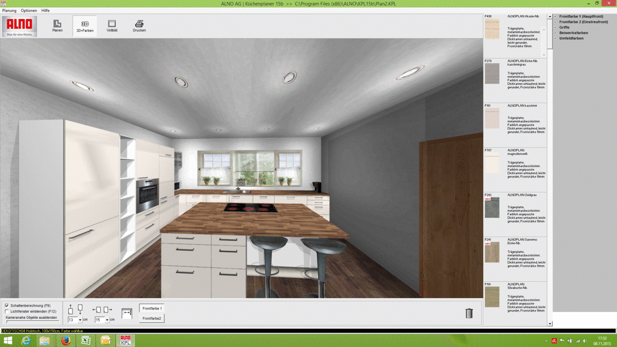 Da der Essbereich gleich daneben ist soll die Küche eher offen wirken (also nicht zu gedrängt), darum auch die Holzelemene. Wichtig ist mir auch der Durchgang durch die beiden Türen. Bei der rechten Tür steht mir die Insel zu sehr in den Raum, da muß ich evtl. weniger tiefe Schränke nehmen. (habe ich im ALNO nicht gefunden)