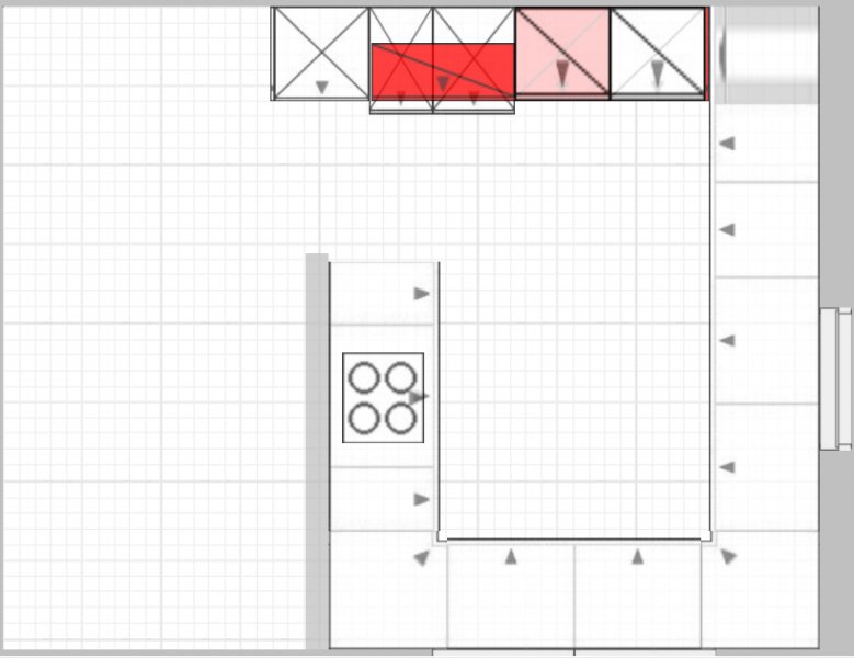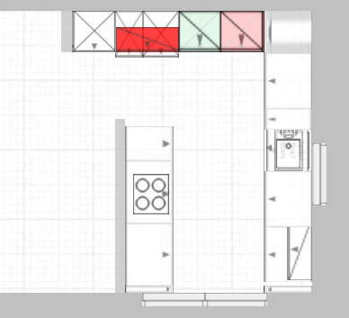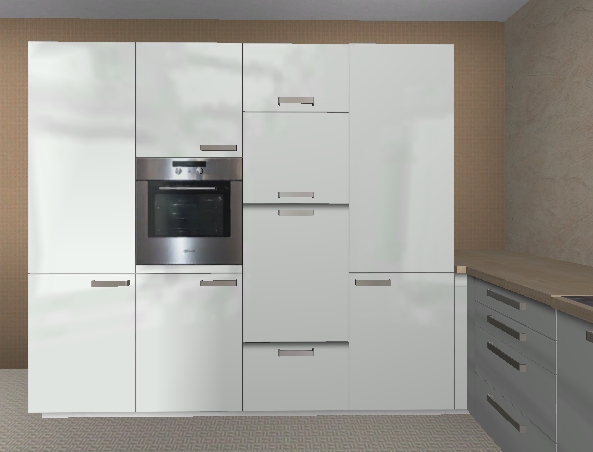 Bei der Planung hab ich Wert darauf gelegt den vorhanden Platz so gut wie möglich auszunutzen. D.h. keine Eckschränke sondern große Schubladenkästen. Die Knackpunkte hier sind mMn der Spülenschrank, das Kochfeld (mit 2 großen Kästen würde es genau in der Mitte dieser liegen) und das Eck zu den Hochschränken. In den Hochschränken soll der Geschirrspüler und der Herd seinen Platz finden. Die vorhandene Mikrowelle wollen wir über dem Herd im Kasten verstecken, da sie nur eine billige Plastikverkleidung hat die nicht sonderlich schön ausschaut.