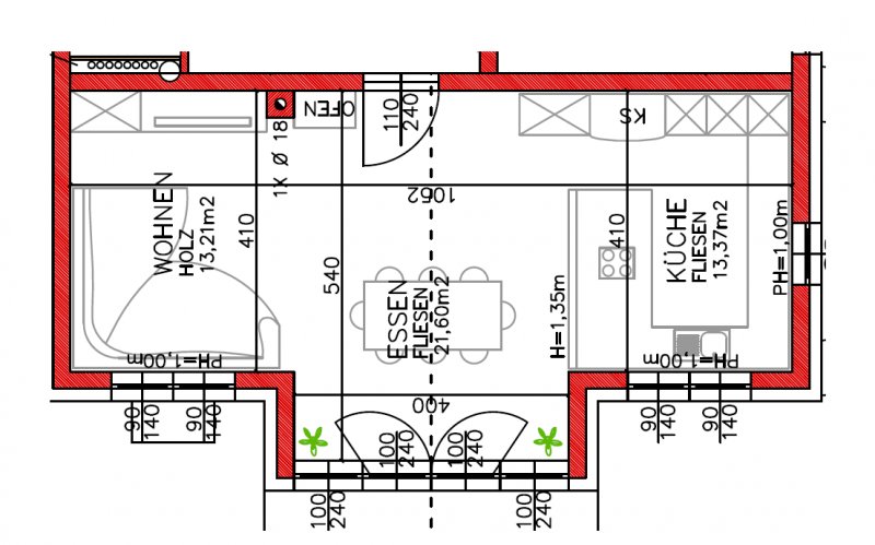 • die eingezeichnete Abgrenzung der Küche (Wand mit H=1,35m) ist optional - wenn sich was schöneres ergibt :-)