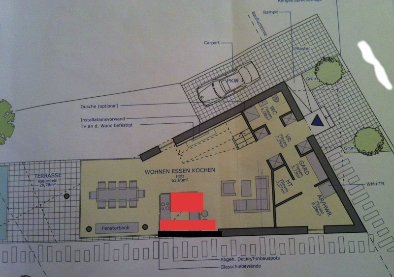 Leider noch keinen Plan mit Maßen - da noch komplett erster Entwurf und es folgen noch 3-4 weitere. Aber gerade die Küche wäre eben ein erster Punkt um ins Detail zu gehen.