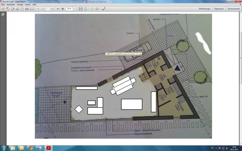 Angehängt habe ich den Grundriss vom EG. Wie gesagt, reine Entwurfsplanung, daher Fenster und ähnliches nicht fixiert. Was fix ist: