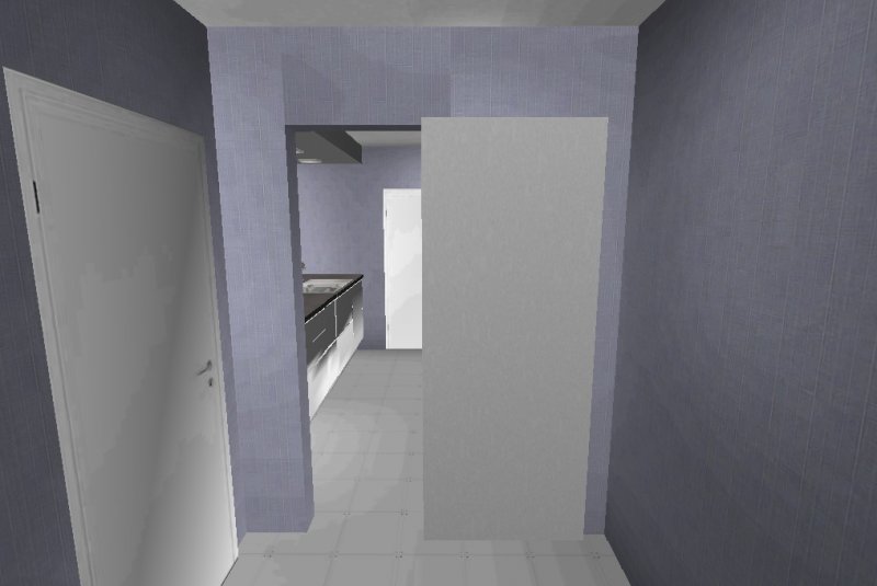 Die Küche hat in meiner Planung eine Schiebetür bekommen, die frei stehende Wand im Wohnzimmer habe ich um 25cm gekürzt. Das verschafft dem Tisch mehr Luft.