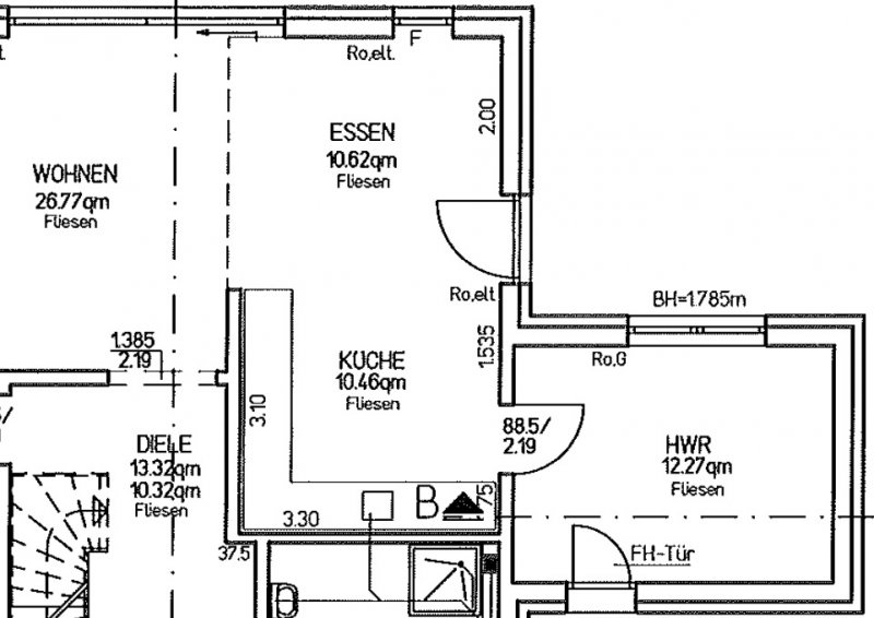Die Küche zu spiegeln, darüber haben wir uns schon unterhalten. Da vor der Kochinsel die Essecke stehen wird, müssten wir uns bei Vollbelegung immer zwischen Tisch und Kochinsel durchquetschen. Daher haben wir bewusst den Durchgang auf dieser Seite. Im HWR wird die ganze Haustechnik stehen, ein zusätzlicher Kühlschrank, Waschmaschine, etc.
