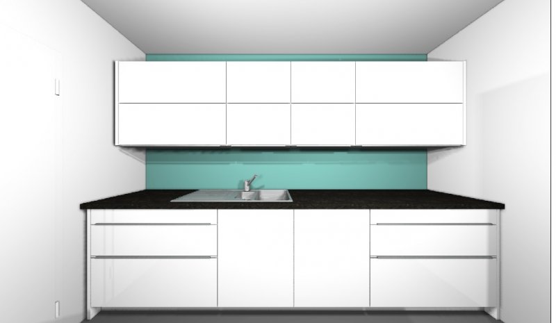 An der 3,10m Wand soll ein einzeln stehender Schrank für Kühlschrank, Backofen und Mikrowelle stehen. Die Wangen sollen hier zumindest im Sichtbereich aus dem Essbereich in glänzend sein. Das gilt auch für die Kochinsel.