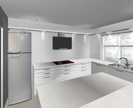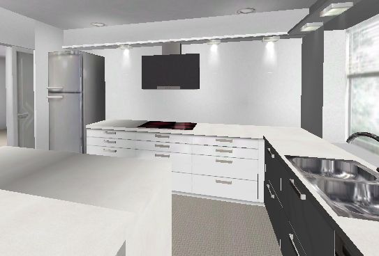 • Abhängung über Kochfeldseite in kompletter Breite mit unterem Brett wie am Fenster um dort auch Licht zu integrieren. Verkleidung dieser Abhängung nach oben mit Trockenbauplatte, hinter der der Abluftkanal zur Fensterseite geführt wird.