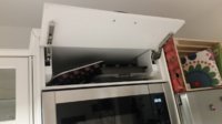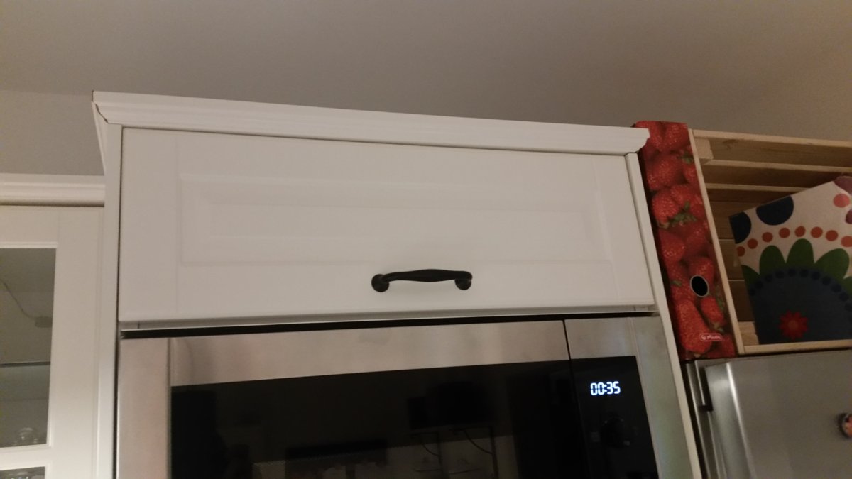 Ergibt 180cm, es verbleiben also über der Mikrowelle 20cm, die irgendwie "verblendete" werden wollen. Zuerst wollte ich es "tot" machen und fest eine 20er Schubladenfront hinschrauben, wollt aber den Platz eigentlich doch nicht herschenken. Auszug macht auf der Höhe auch keinen Sinn, so hab ich ein Utrusta Scharnier für horizontale Wandschränke verwendet. Die sind zwar herstellerseitig eigentlich für Fronten ab 40cm gedacht, es funktioniert aber auch mit 20er Fronten ganz gut