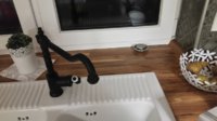 Die große Domsjö Spüle ist von Ikea so gedacht, dass sie links und rechts auf der Arbeitsplatte aufliegt, dahinter aber keine Arbeitsplatte mehr ist und direkt an die Wand anstößt. Durch unsere vergrößerte Arbeitsplattenfläche (Tiefe ca. 70 cm) bzw. durch die noch weitere Verlängerung als Fensterbankersatz, hatte ich während der Planung schon die Befürchtung, dass sich die Spüle hinten nicht auf die Arbeitsplatte auflegen lässt. Dem ist aber nicht so, der hintere Teil der Spüle kann theoretisch ca. 15 - 20 cm aufliegen (dann müsste man aber wieder ein Loch für die Armatur einschneiden). Ich hab es letztendlich so gemacht, dass ich den Bereich für die Armatur großzügig ausgeschnitten hab (da liegt die Spüle noch ca 3 cm auf der APL auf), die restliche Breite sinds ca. 7 - 10 cm Arbeitsplatte, auf der die Spüle hinten aufliegt.