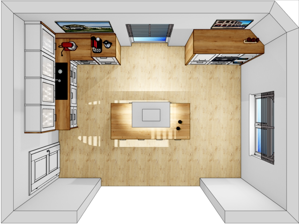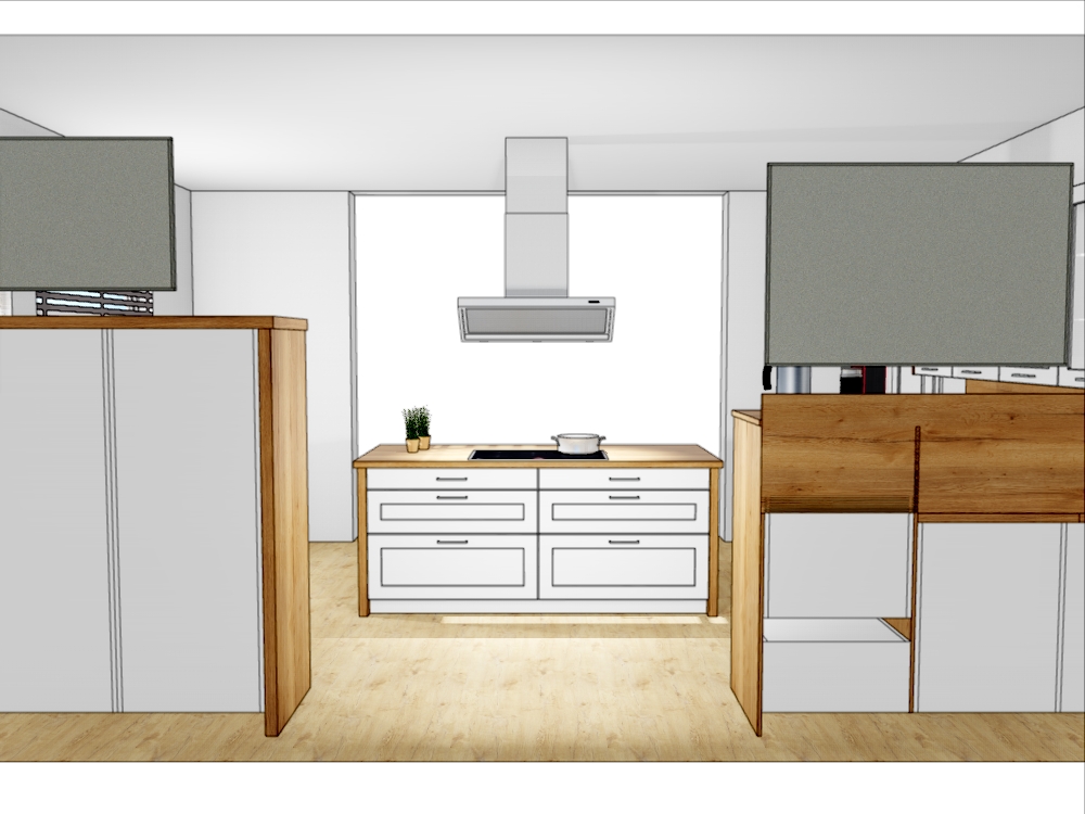 Zur Kochinsel haben wir die Idee, dass wir sie statt mit den Wangen mit roten Ziegelsteinen umfassen (das Haus ist ein altes Ziegelsteinhaus) Daher würde die Arbeitsfläche der Insel auf beiden Seiten etwa 25cm länger, die Unterschränke, Herd und Abzugshabe verschieben sich entsprechend um 25cm nach rechts.