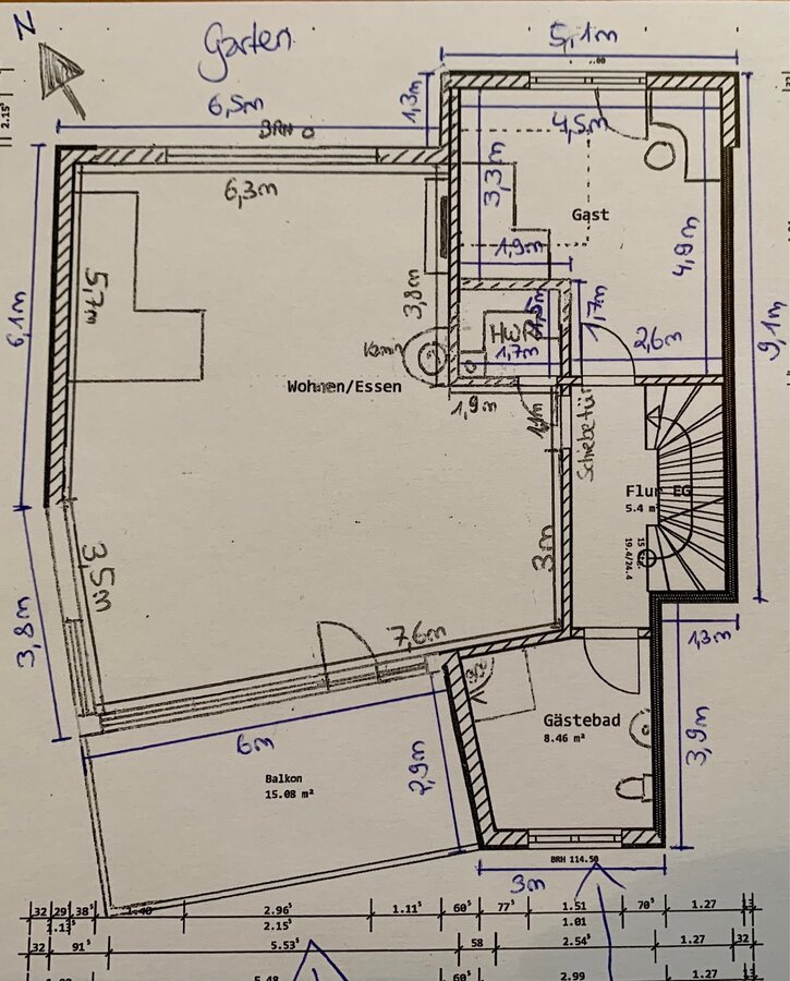 Angehängt ist einmal der "leere", bemaßte Grundriss und zwei Skizzen mit unseren Ideen (Küche links bzw. rechts). Bitte ignoriert die gedruckten Maße. Die sind nicht mehr aktuell.