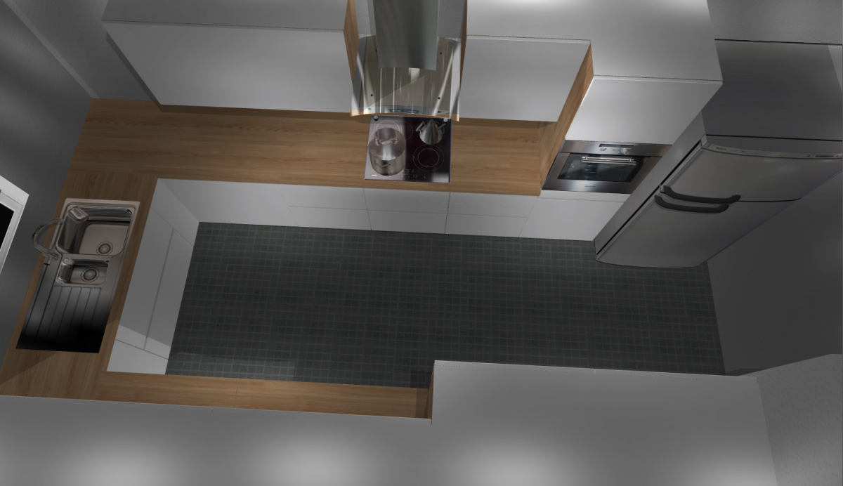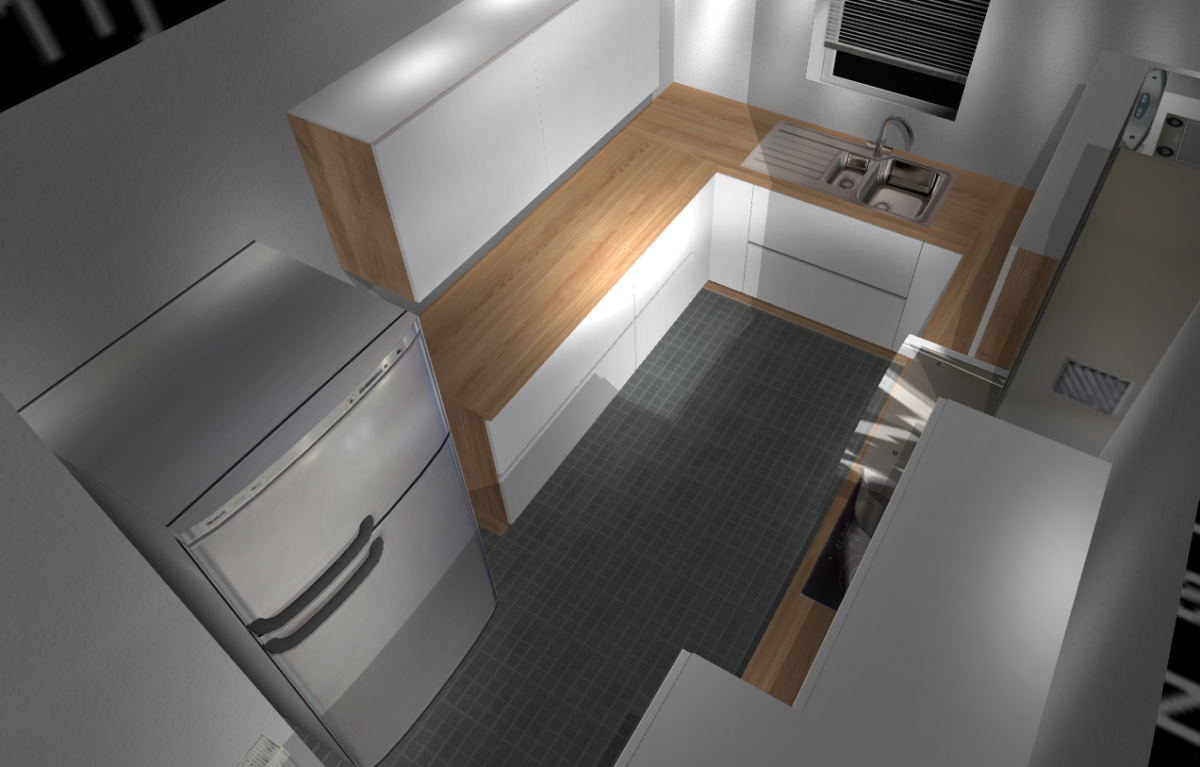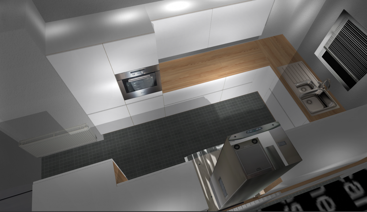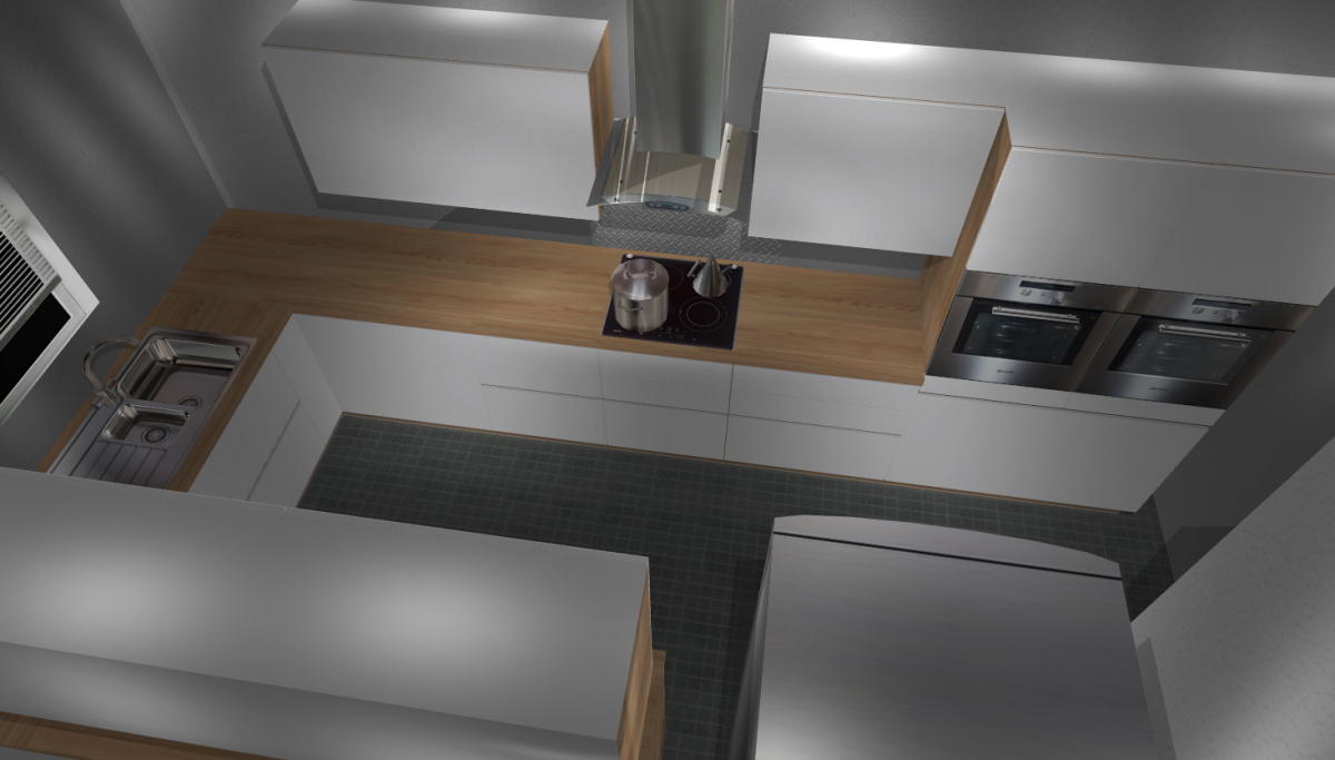Unsere erste Idee war eine U-Küchenform zu verwenden. Unser Wunsch ist eine braune Arbeitsplatte mit weißen Schränken: