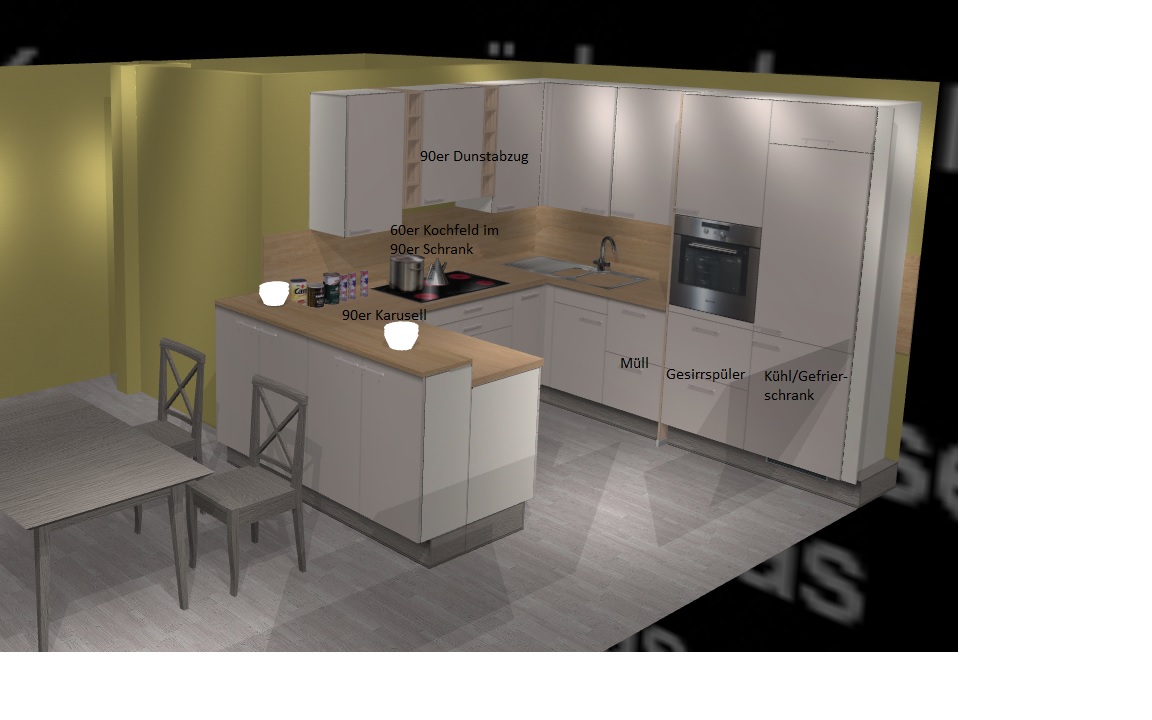• 90er Eck Karusell weglassen und dafür die Schränge größer machen 30er neben Kochfeld -> 60er und 90er zum 120er?