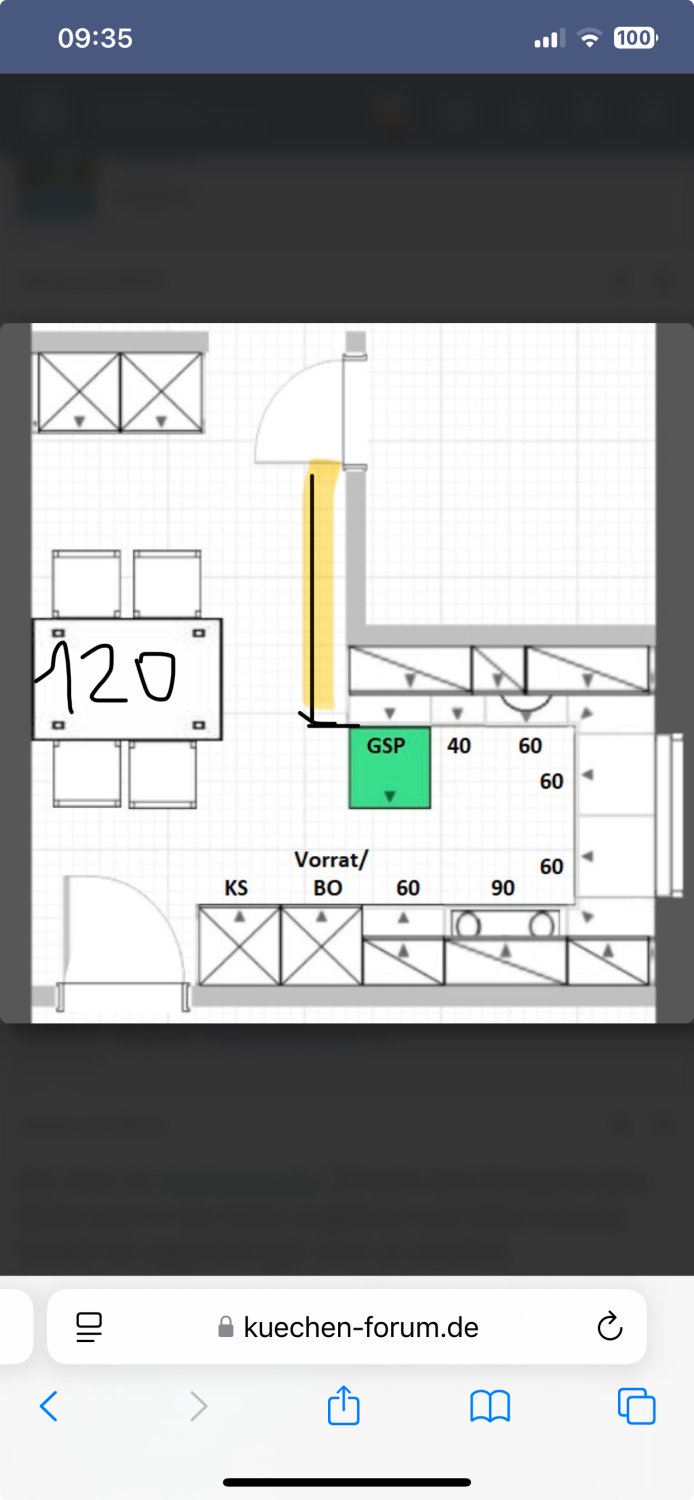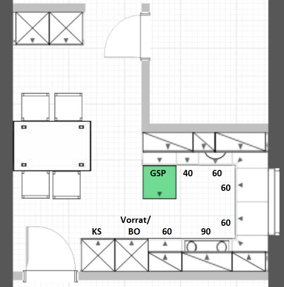 Wo meinst du genau? Kannst du das einzeichnen?Was mir auch ganz gut gefallen würde, wäre an der langen Wand zwischen Wohnzimmer und Wintergarten noch ein zweier Unterbauschrank mit Auszügen (Tiefe 40cm), mit zwei Regalbrettern an der Wand (so wie bei Evelin --- DANKE!!!) . Hier könnte ich dann den