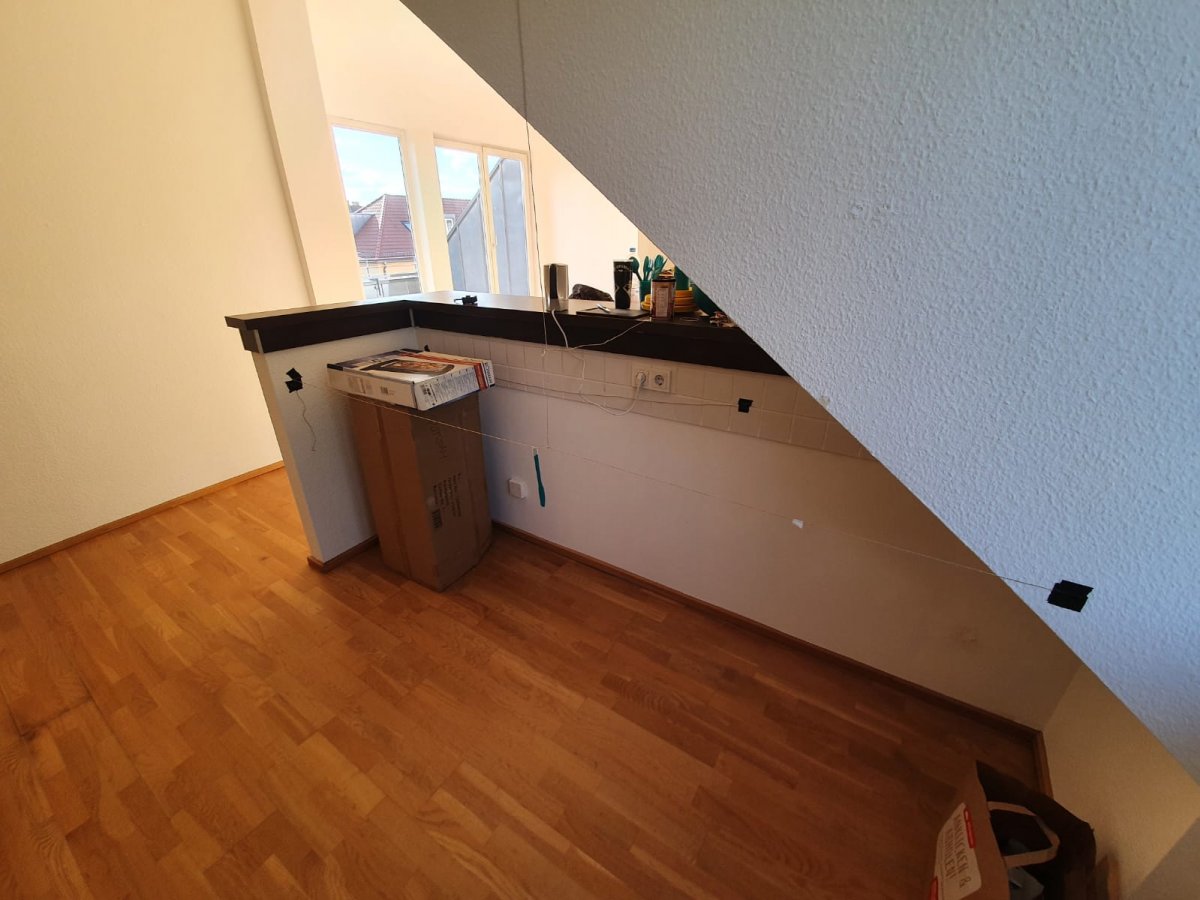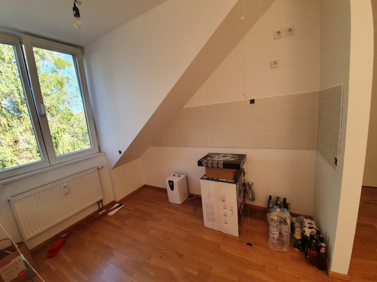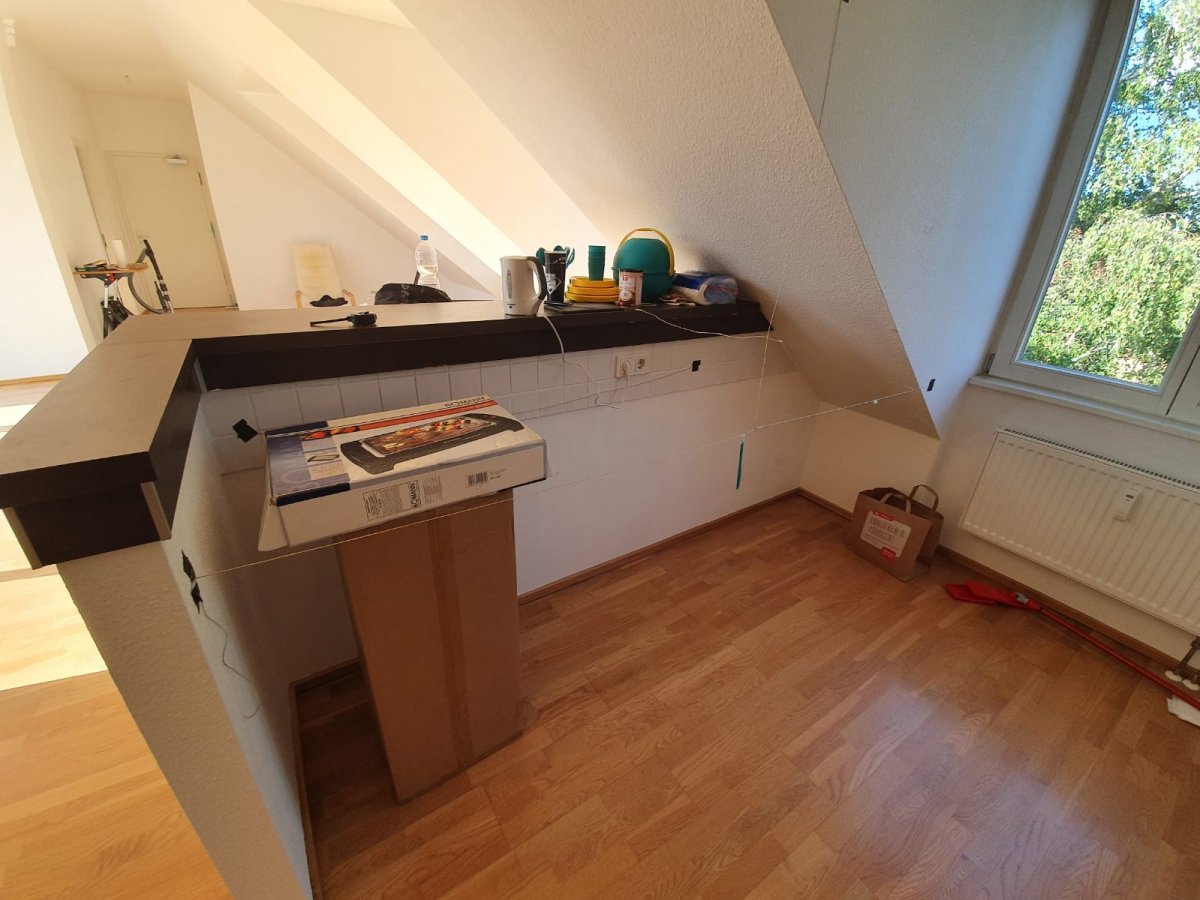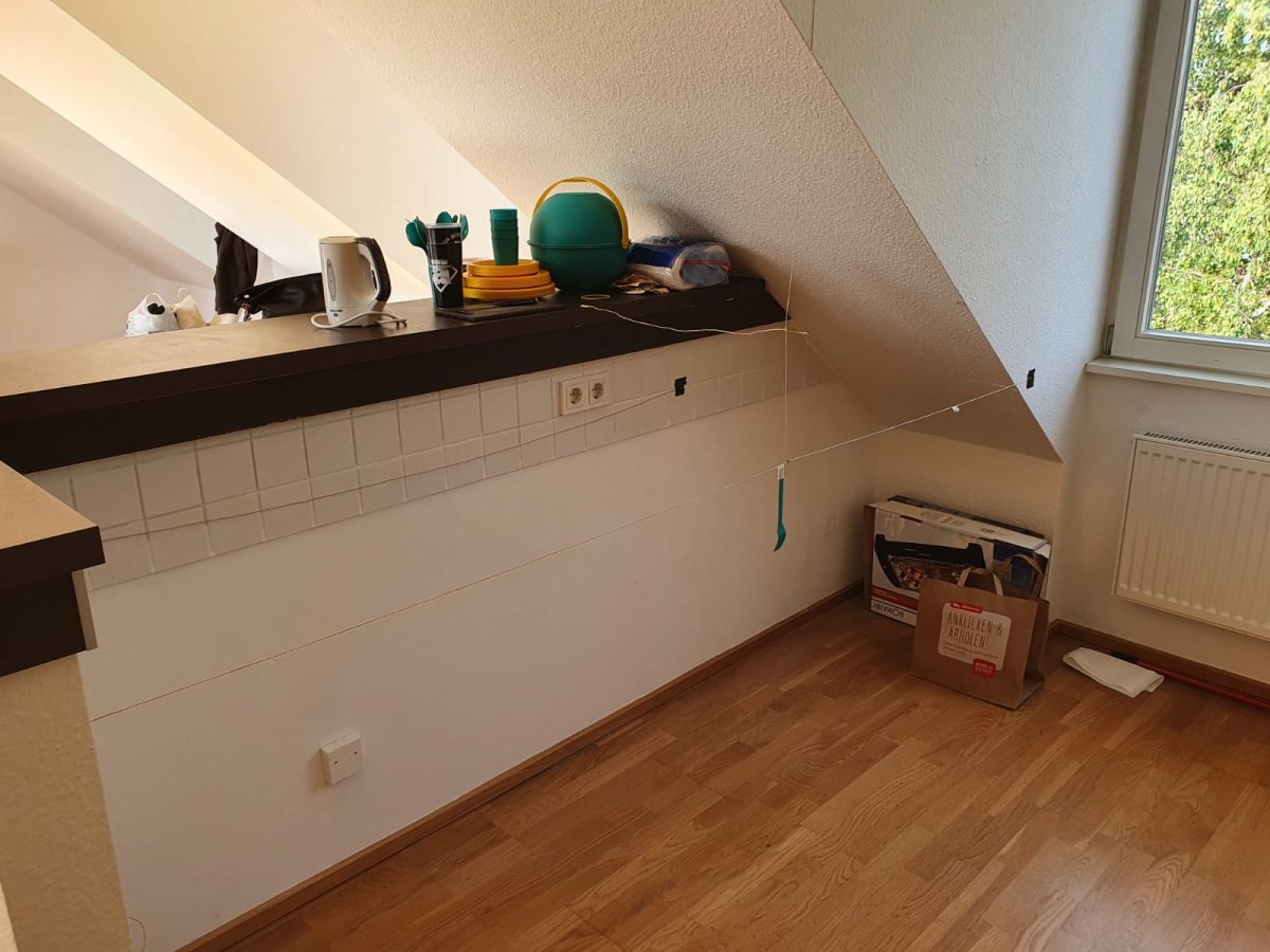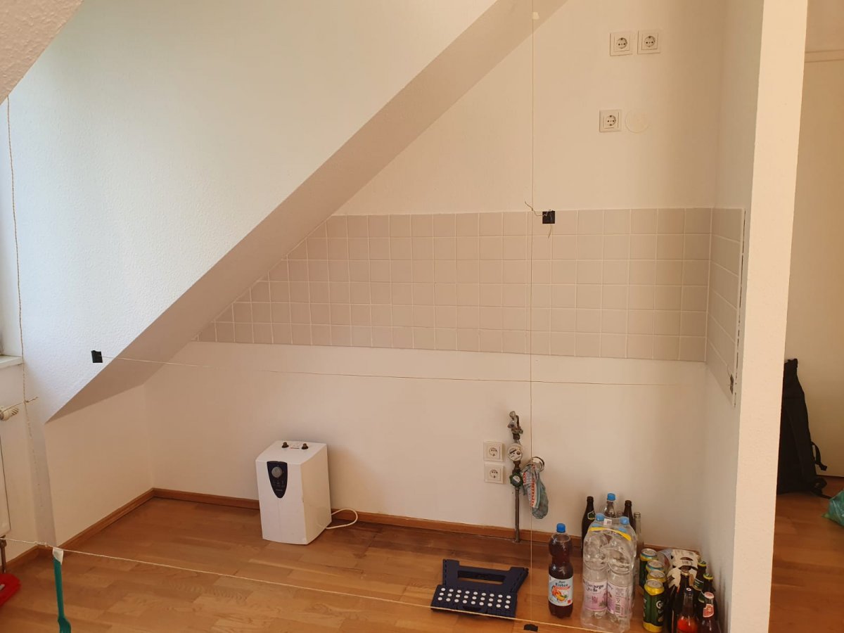 Wir beziehen eine neue Mietwohnung im 3. OG / DG mit größtenteils Gaubenfenstern und Dachschrägen, so auch in der Küche.
