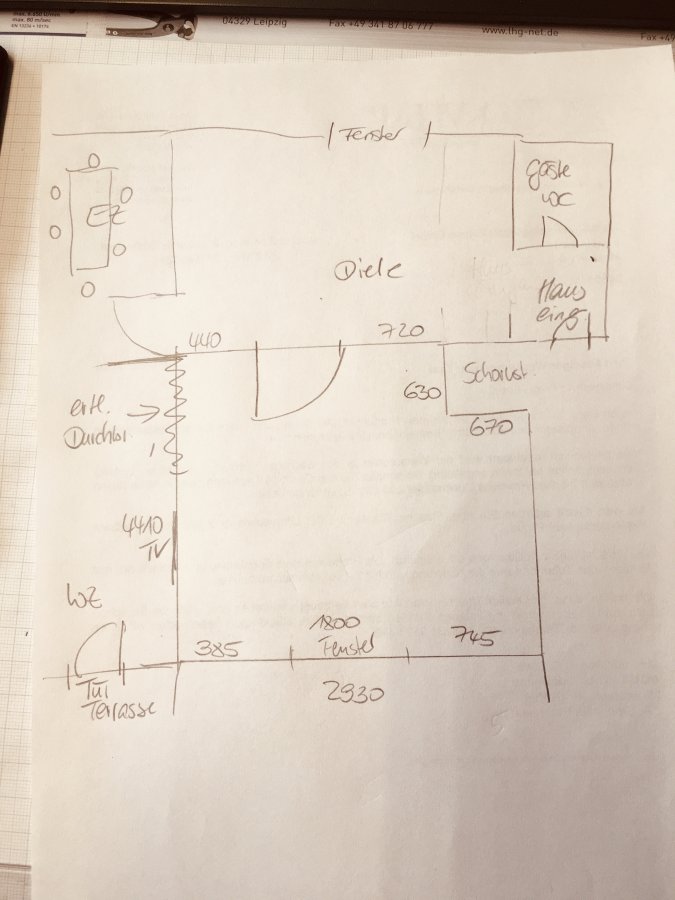 Wasseranschluss momentan 130 vom Fenster zum Schornstein die Wand.