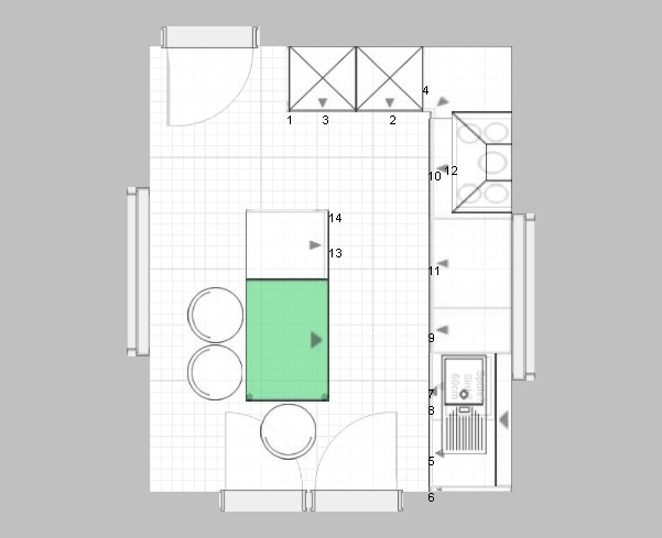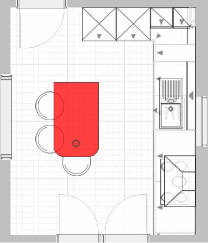 • Mittig eine *Tischkonstruktion* auf APL-Höhe, eventl. niedriger als die Zeile, damit man einen Platz für schwere Knetarbeiten und Arbeiten im Sitzen hat. Stühle -> höhenverstellbare Barhocker die man unter die Platte schieben kann, dann bleiben die Durchgänge *frei*