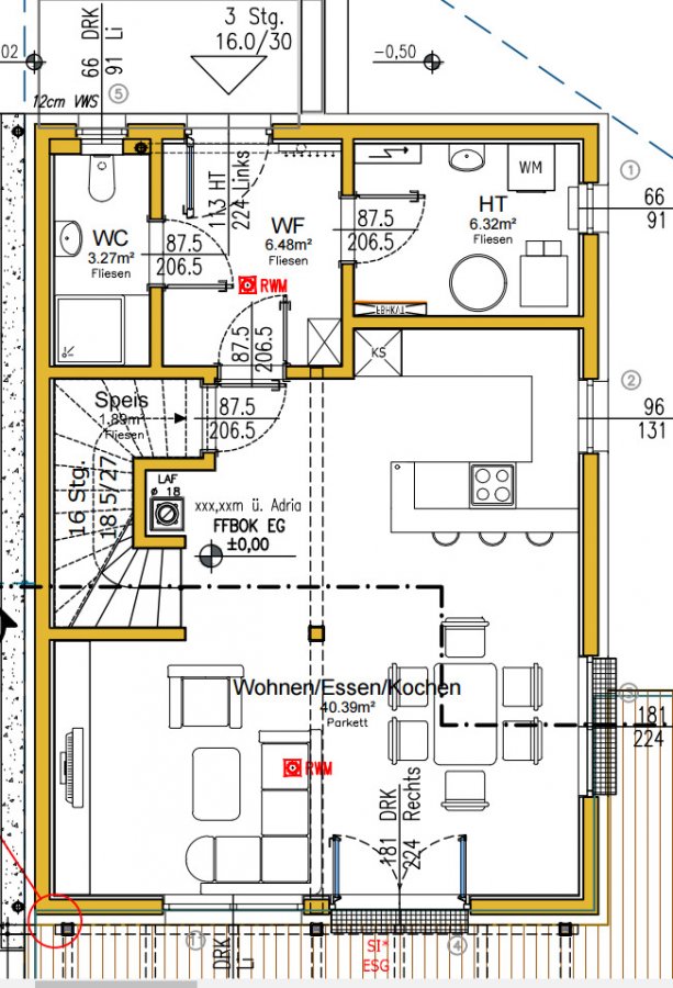 Die Küche soll planlinks offen bleiben oder könntet Ihr Euch auch eine Zwischenwand vorstellen? Ich meine nicht ganz geschlossen sondern planlinks oben mit Durchgang und nur ca. 2.00 m lang. Da würde ich Kühlschrank, Backofen -Hochschrankwand und einen Vorratshochschrank stellen.