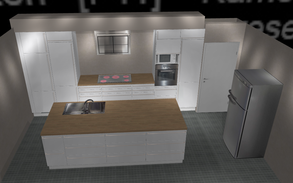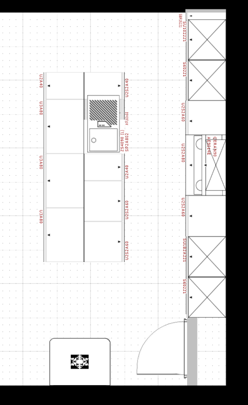 Ich habe Dir einfach mal eine Insel-Küche zusammengeschoben, wie ich sie mir in meinem Grundriss aus #15 vorstellen könnte. Die Küche wäre ca. 5,50 Meter lang, abzgl 1m Tür (die ich im Küchenentwurf um die Tiefe der HSs in die Küche rein verlegt habe), bleiben 4,50 Meter Länge für eine Küche.