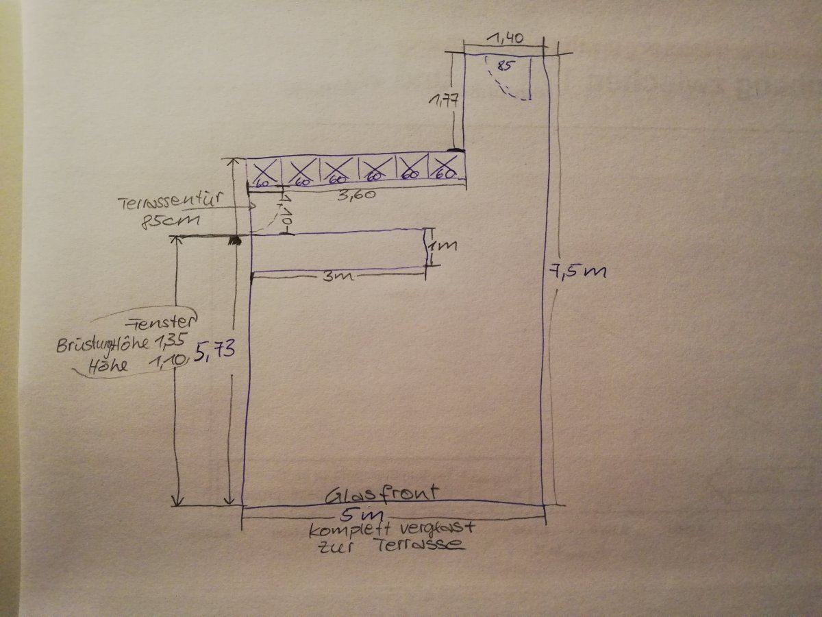 Die Raummaße sind schon fix. Fenster können noch geändert werden. Wir haben einen offenen Dachstuhl (15 Grad Dachneigung).