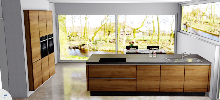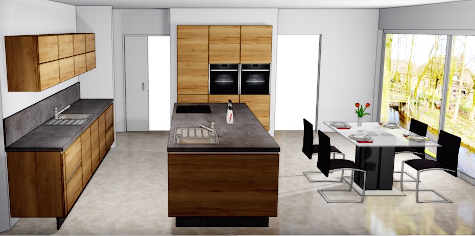 Ich hab mal alles zurück auf 0 gesetzt und mir gedacht, was ich tun würde wenn das meine Küche wäre. Mal davon abgesehen, daß mir das ein bissel viel Holz ist, gefällts mir ganz gut so.