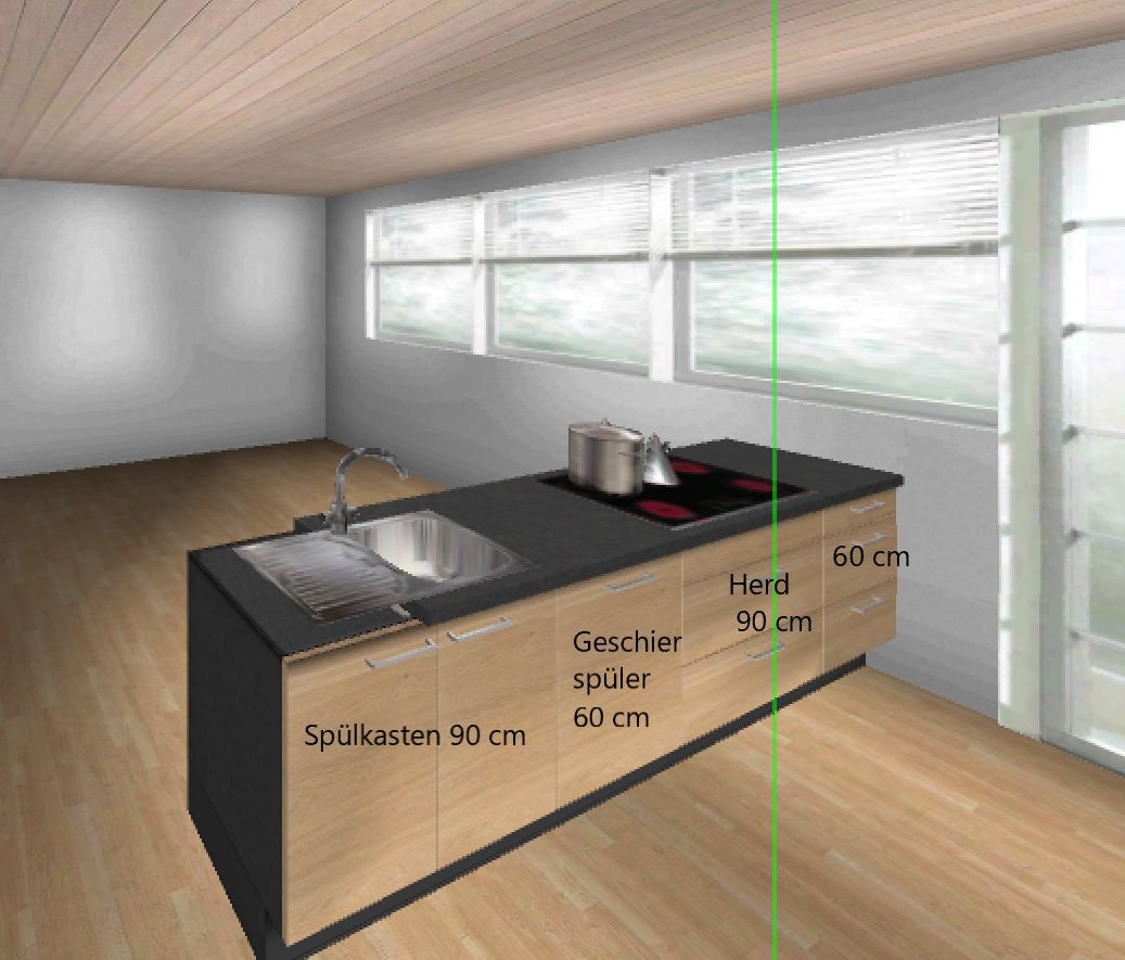 Damit wären (inkl. Abstand nach links und rechts) die 3 Meter der Insel quasi aufgebraucht, ihr habt weder Arbeits- noch Stellfläche. Das sollte also noch mal überdacht werden. Aber halt nur mit besser lesbaren Angaben und euren Gedanken.