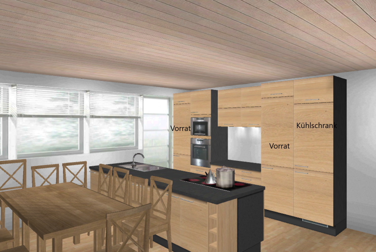 Wir sind uns noch nicht sicher, ob wir bei der hinteren Küchenzeile nur Hochschränke oder auch eine Nische einplanen sollten.
