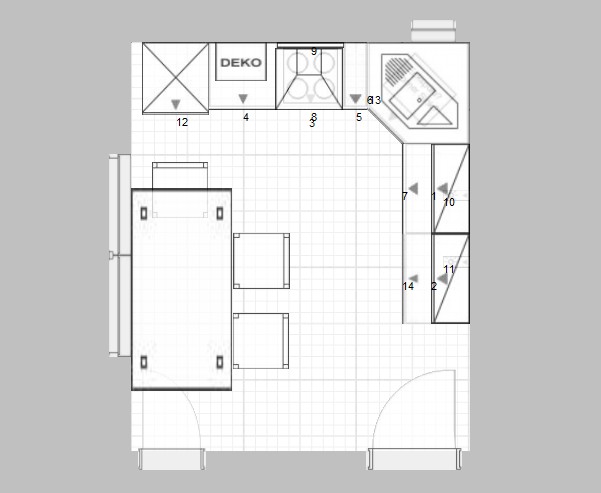 Der Herd muss etwas an der Stelle stehen, weil dort Abluft vorgesehen ist. Die Spüle muss ebenfalls etwa dort stehen, weil dort die Anschlüsse sind, das könnte man aber ändern.