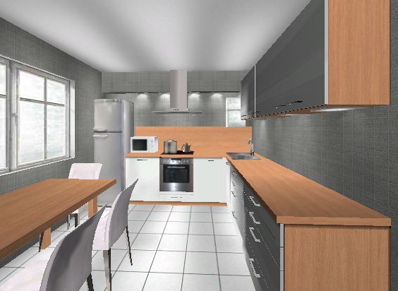 Das ergibt zusammen mit der freihängenden DAH in angenehmer Breite ein modernes Bild. Ich habe hier mal unter der Decke eine Abluftkanal-Verkleidung mit angebracht, die dann gleichzeitig noch Einbaustrahler für die APL-Beleuchtung aufnehmen könnte.