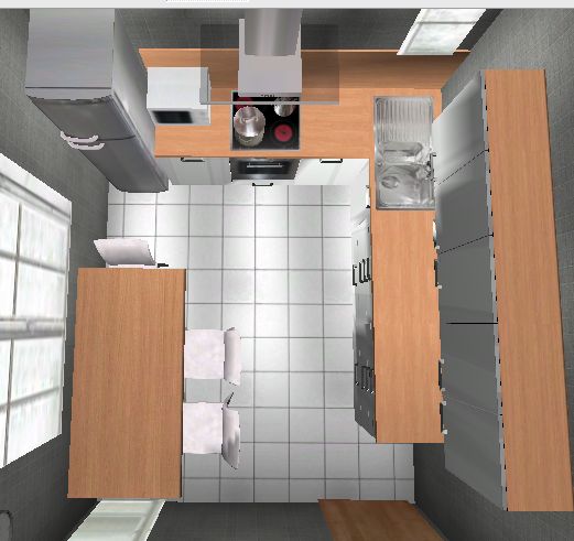 Ich würde die Spüle dann noch etwas weiter richtung Tür ziehen und dann ist alles tutti, oder den herd etwas zum Kühlschrank,, gibt dann zwar kleine Schränke, aber mehr Bewegungsfreiraum.