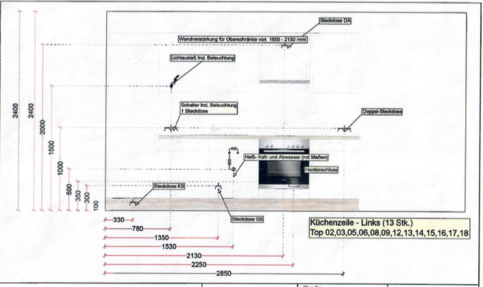 Hier noch das Bild mit den Anschlüssen, wie wir den Küchenplan vom Bauunternehmen erhalten haben. Es wäre nur eine Küchenzeile eingeplant gewesen, an der kurzen Wand neben der Tür.