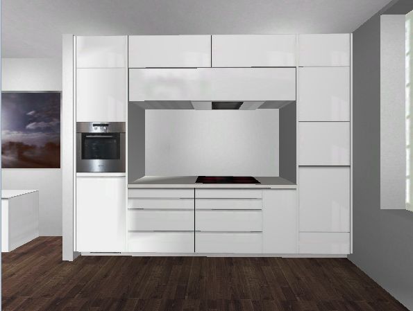 - Drüber in einer Verkleidung eine Decken-DAH wie die Novy Pureline. Der Umluftauslass dazu durch den Schrank oben nach planlinks in die Trockenbauwand und dort dann nach links ausblasend. Alternativ nach planrechts und über der GSP ausblasend