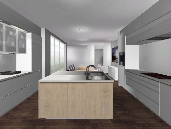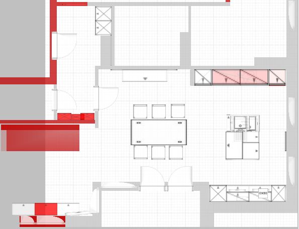 Hier in diesem Schrank müßte ein Wasser-/Abwasseranschluß landen. Das sind eigentlich nur ca. 200 cm über den Boden. Bei mir in der Küche hat das problemlos in den Fußbodenaufbau gepaßt.