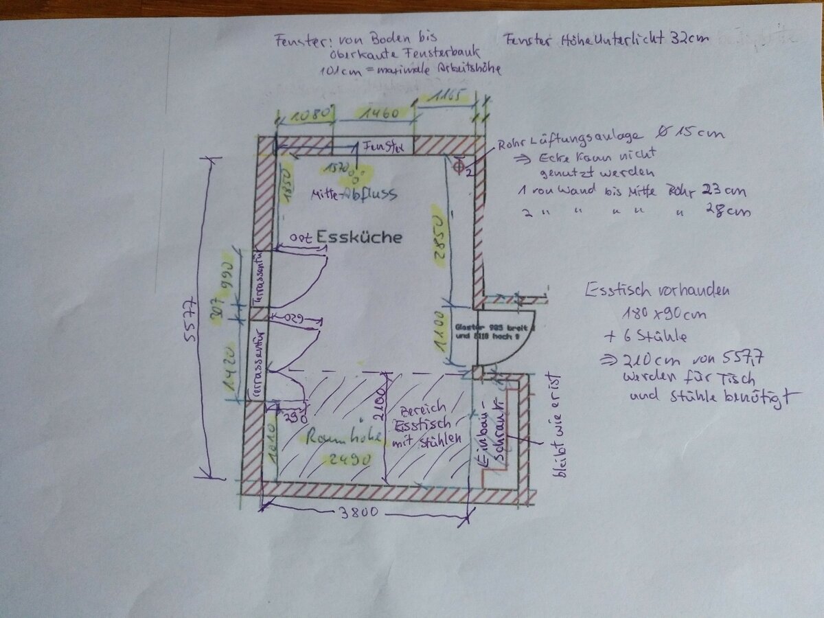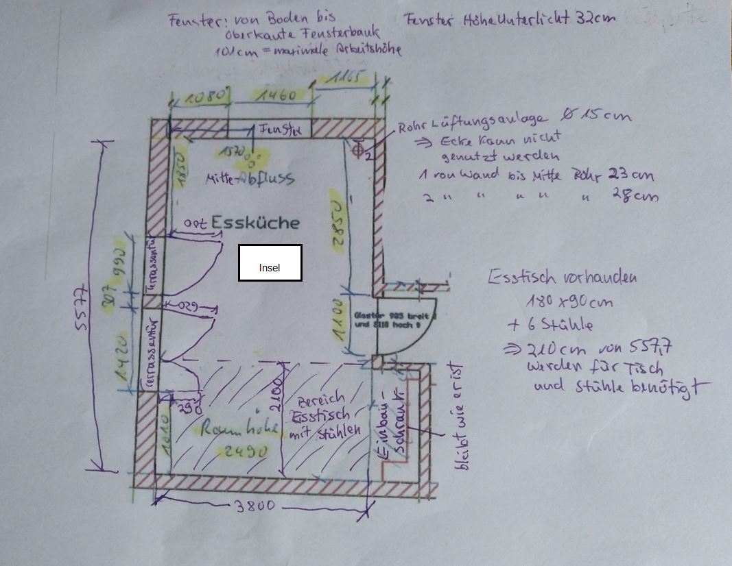 Generell sind wir unentschlossen, wo das Kochfeld sein soll (Möglichkeiten: links neben der Spüle (Wand mit Fenster), Wand mit Terrassentüren oder Insel?